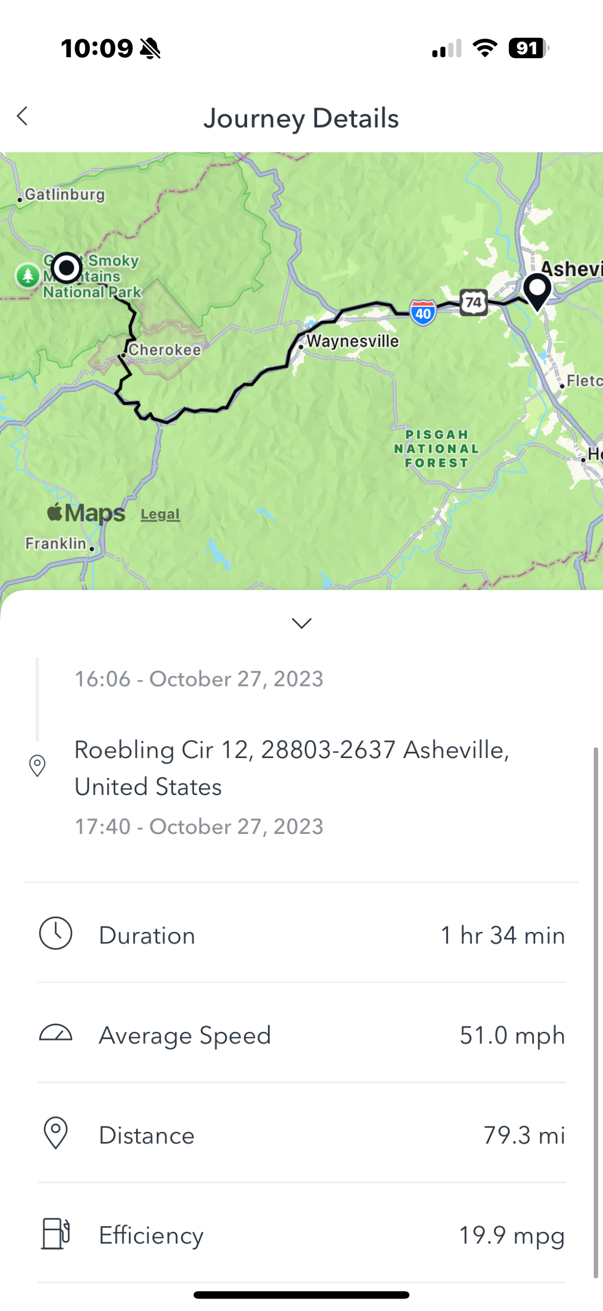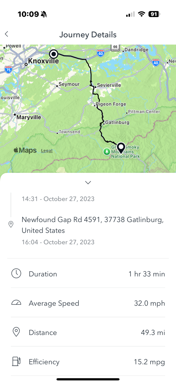 Last October I drove down to Asheville for one of the LR Experience Owner's Days. So far, this is the longest trip I took with my Defender. Cincinnati to Asheville was 394.2 miles - that includes a detour through the Smoky Mountains over the Newfound Gap. Usually, I just take I-40 from Knoxville to Asheville, but decided to take a detour on this trip. Unfortunately this detour I made is now the most direct route now that I-40 is closed after the hurricane. I managed to average over 17 mpg in my P300 despite going at a high rate of speed and having the slightly larger all-terrains. This is about the same fuel economy I got with my old 5.0 LR4 on the same journey. I also wanted to note that I had no noticeable loss of power at 5000 ft. above sea level.