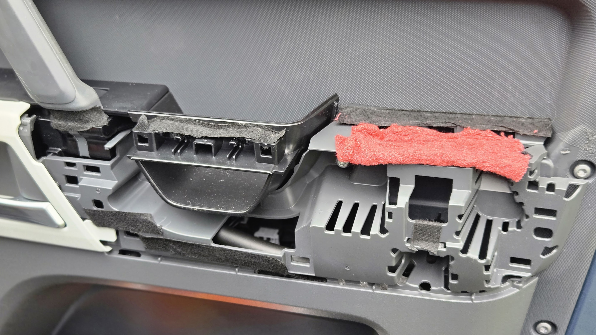 I lined the contact areas with interior Tesa (non-flammable!!!!) tape. Its not very sticky stuff but then it doesn't need to be. The contact point I think that was causing the squeaking was right under the handle. I had a little scrap of (new) shop rag on the top surface but I ended up not needing that - replaced it with another piece of Tesa tape. None of the tape is visible with the armrest reinstalled.