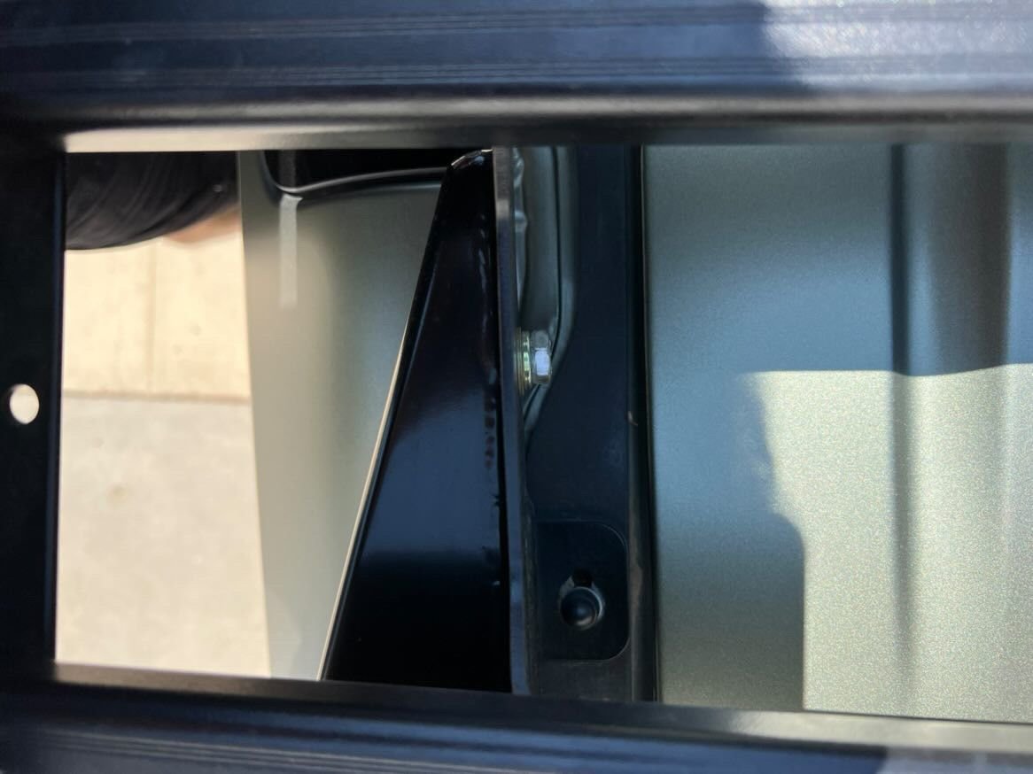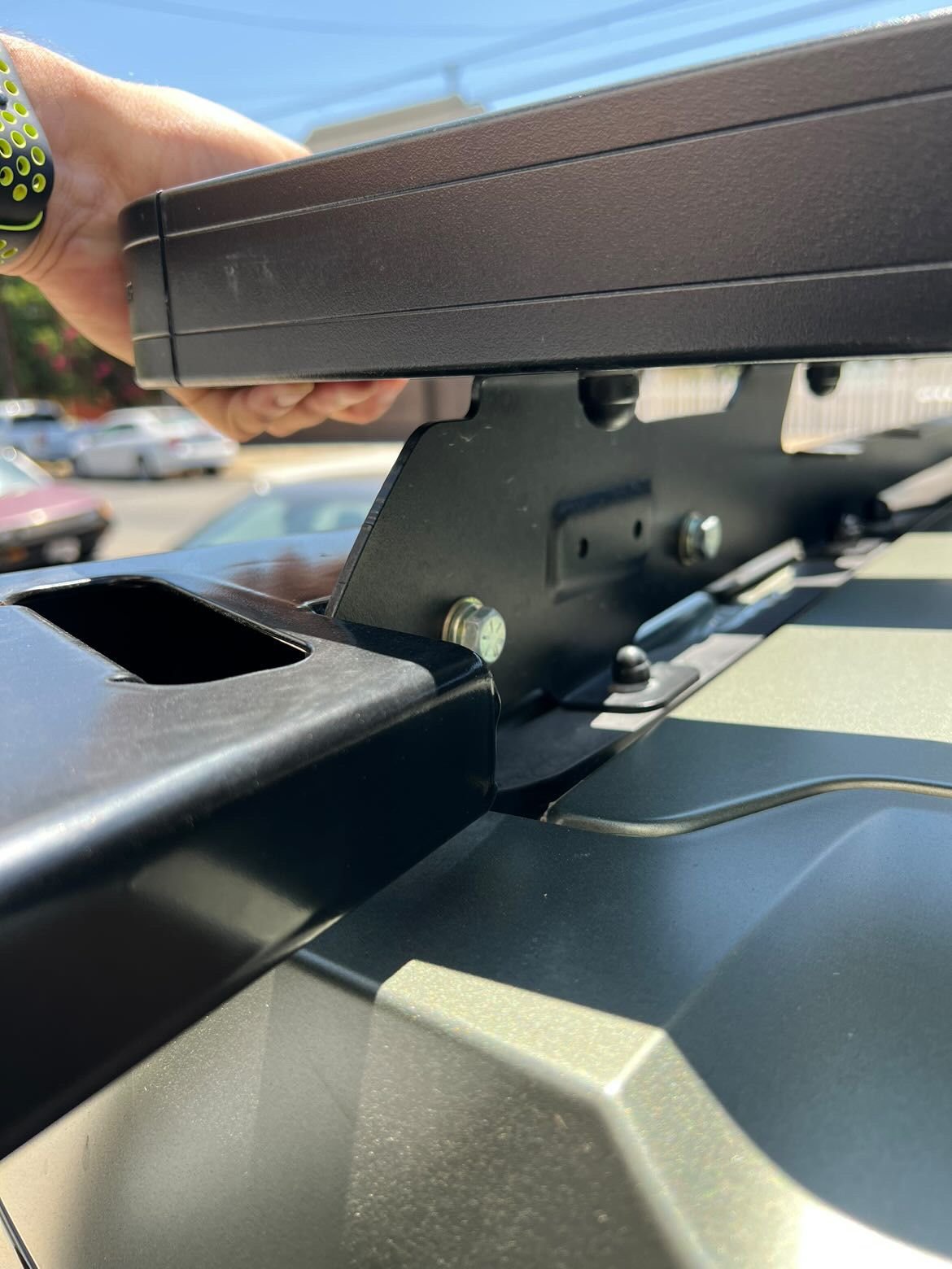 "So what you get from L8 is more of a wedge / V at the top. And it slots into the OEM rails. No issues with OEM rack. What Galpin did was cut into it. Making it more L shape vs V. They then powder coated it to be weather resistant and put a few mounting points into the Front Runners rails as there were no holes."