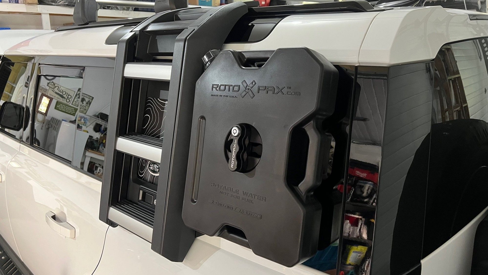 Installed the BA Tents Rotopax Ladder Mount to carry extra coolant. I typically carry extra fluids (coolant, oil, gear fluid, transmission fluid, brake fluid...) when off-roading. I had my extra coolant container inside the Defender and it leaked (factory LR 1-gallon jug)...what a mess.