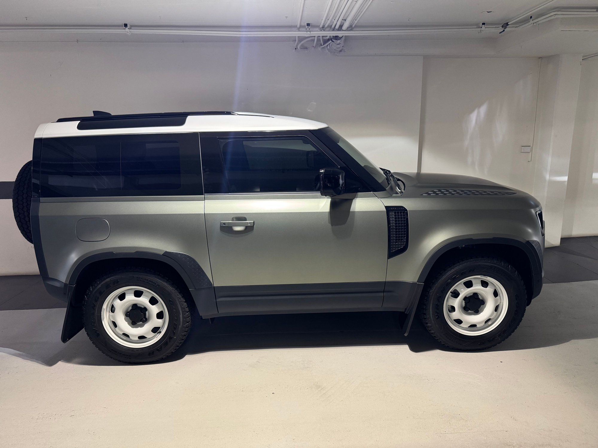 Pangea Green with stock white roof + white steelies and exposed tow eyes.