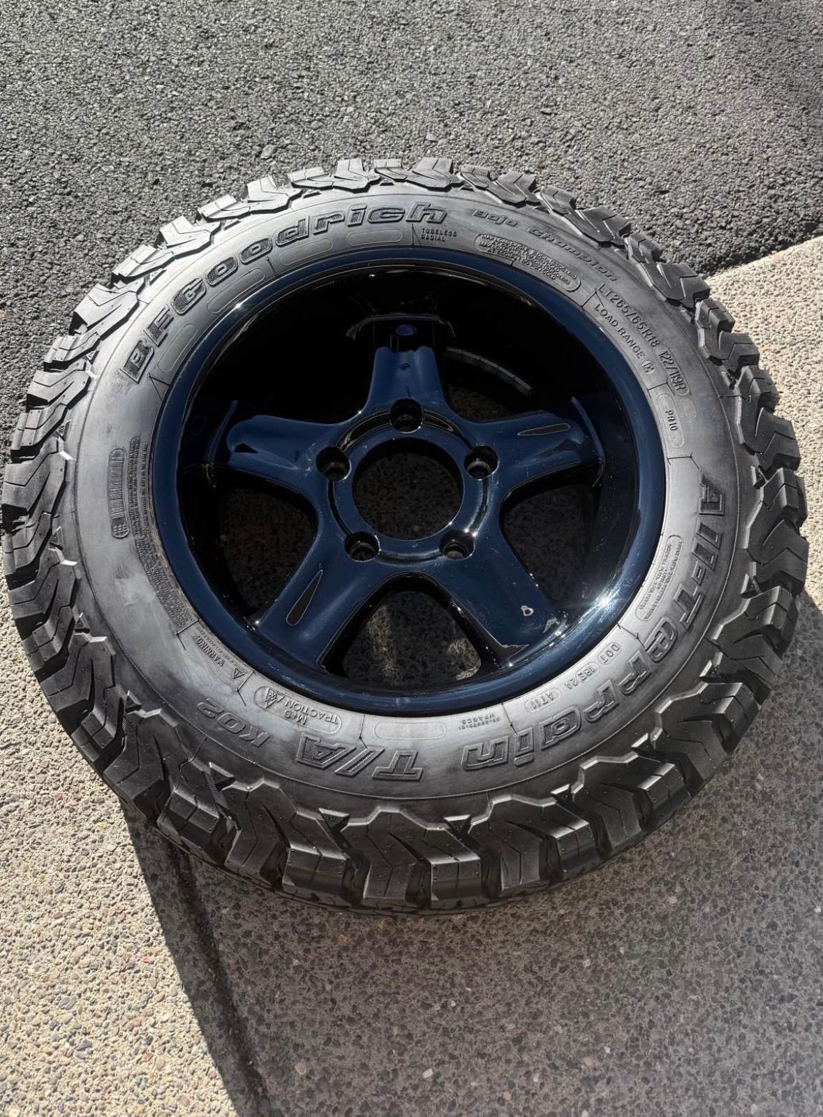 These are minimally used less than 1000k on them gloss black. Set of 5 with lug nuts and four center caps.