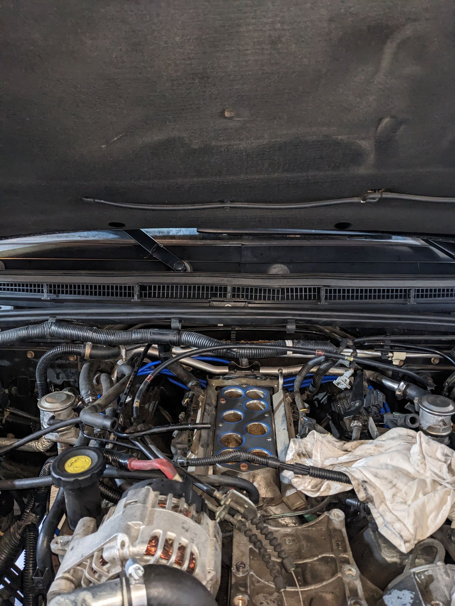Still waiting for the new bumper so I thought I'd do coils and wires. Nothing that hasn't been discussed in depth here, but the coil packs locations are a bit tricky. Also, those little threaded rods with nuts to hold the SAI onto the manifold came out easily, but why Land Rover didn't use bolts was beyond me... The upper and lower intake manifolds were pretty clean! This truck keeps surprising me with how well it seems to have been cared for over the years. I also cracked that stupid windshield cowl even more by touching it too hard (it's like a giant egg shell at this point).