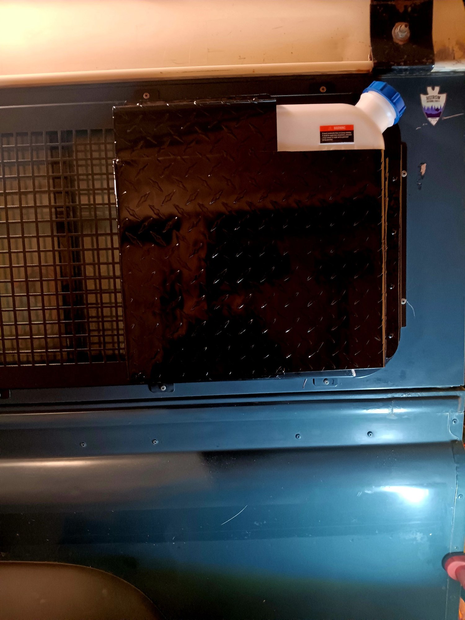 Installed some aluminum angle pieces to box, painted and pop-riveted the box to window guard. Added four hinges on bottom, original hinge was crappy.