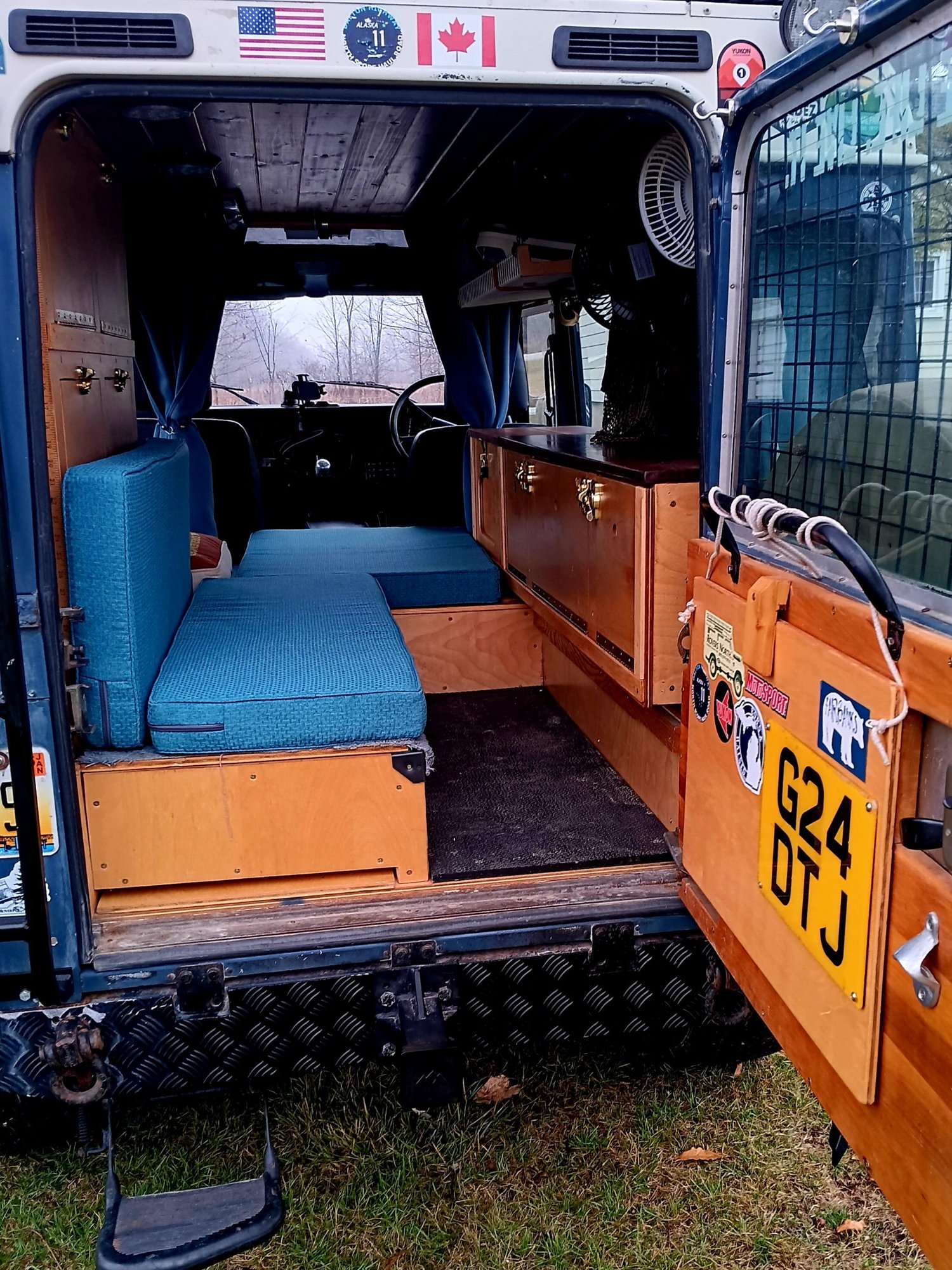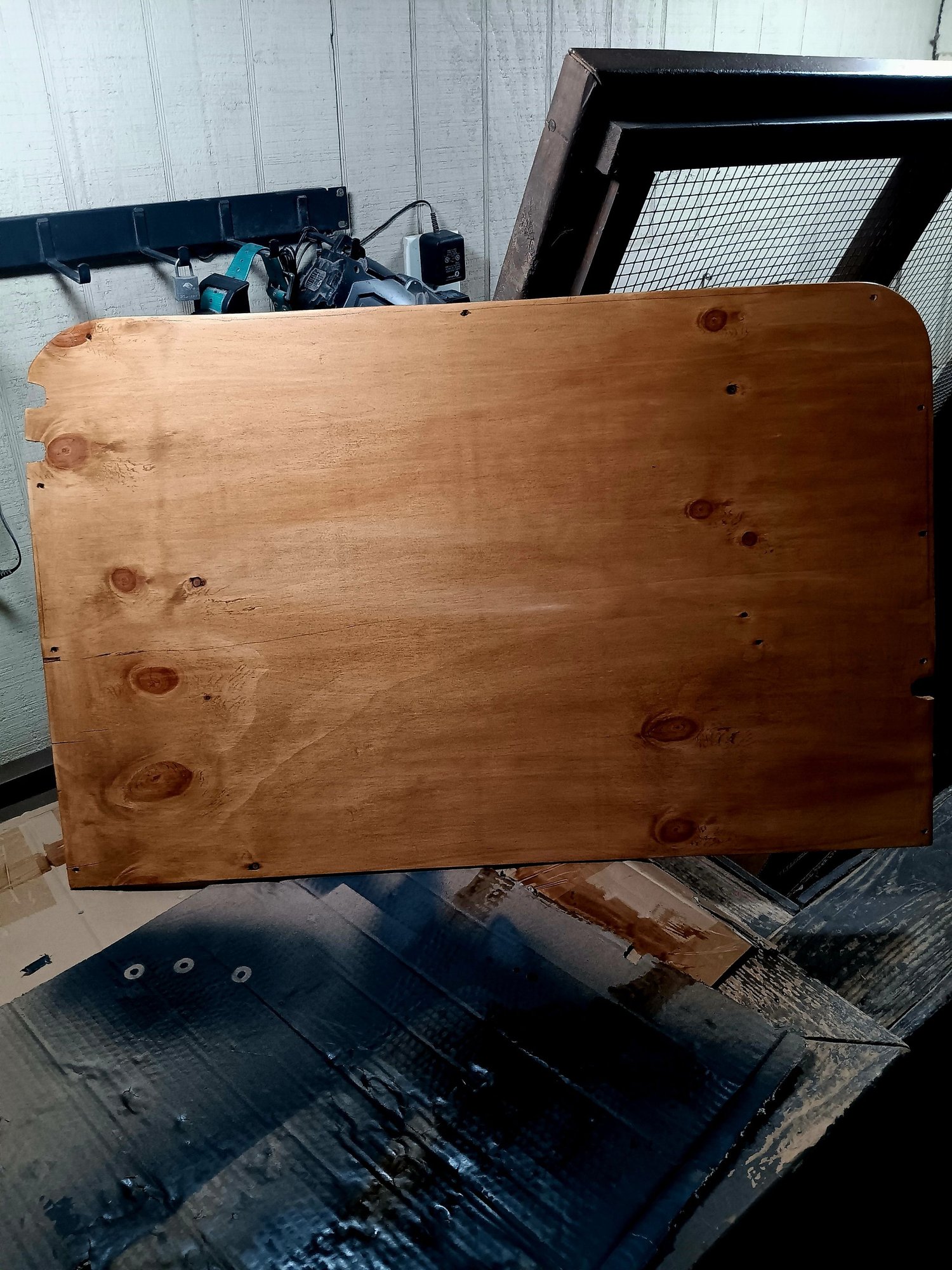 So, decided to do something with rear door. Cut a piece of plywood and stained it, to cover rear glass.