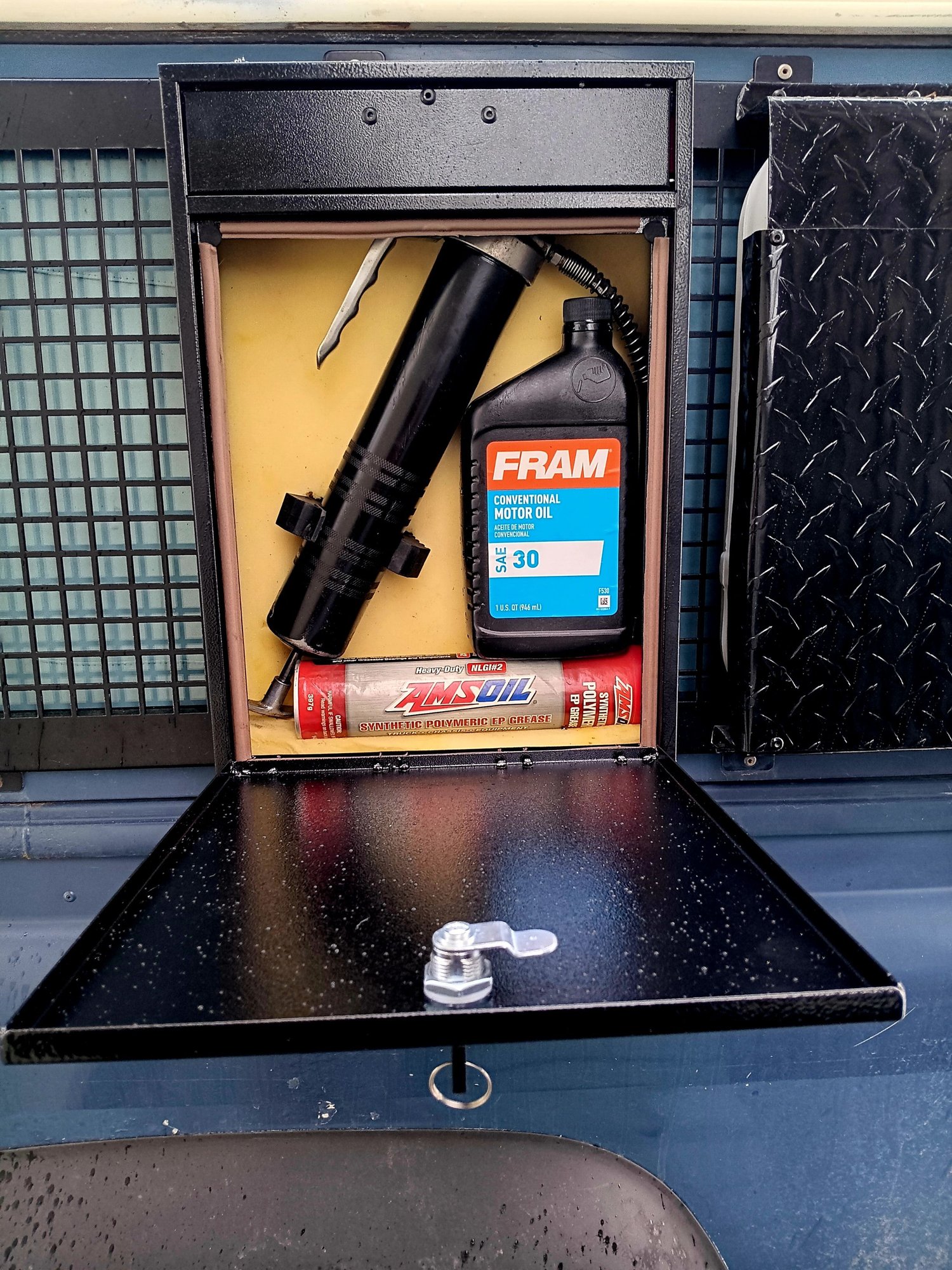 Lined box with foam and used an old shovel holder to hold grease gun. I'm a freaking freak about greasing u-joints. Did it every 1K on my trip to Alaska. I'd much rather grease a u-jount...than change a u-joint.