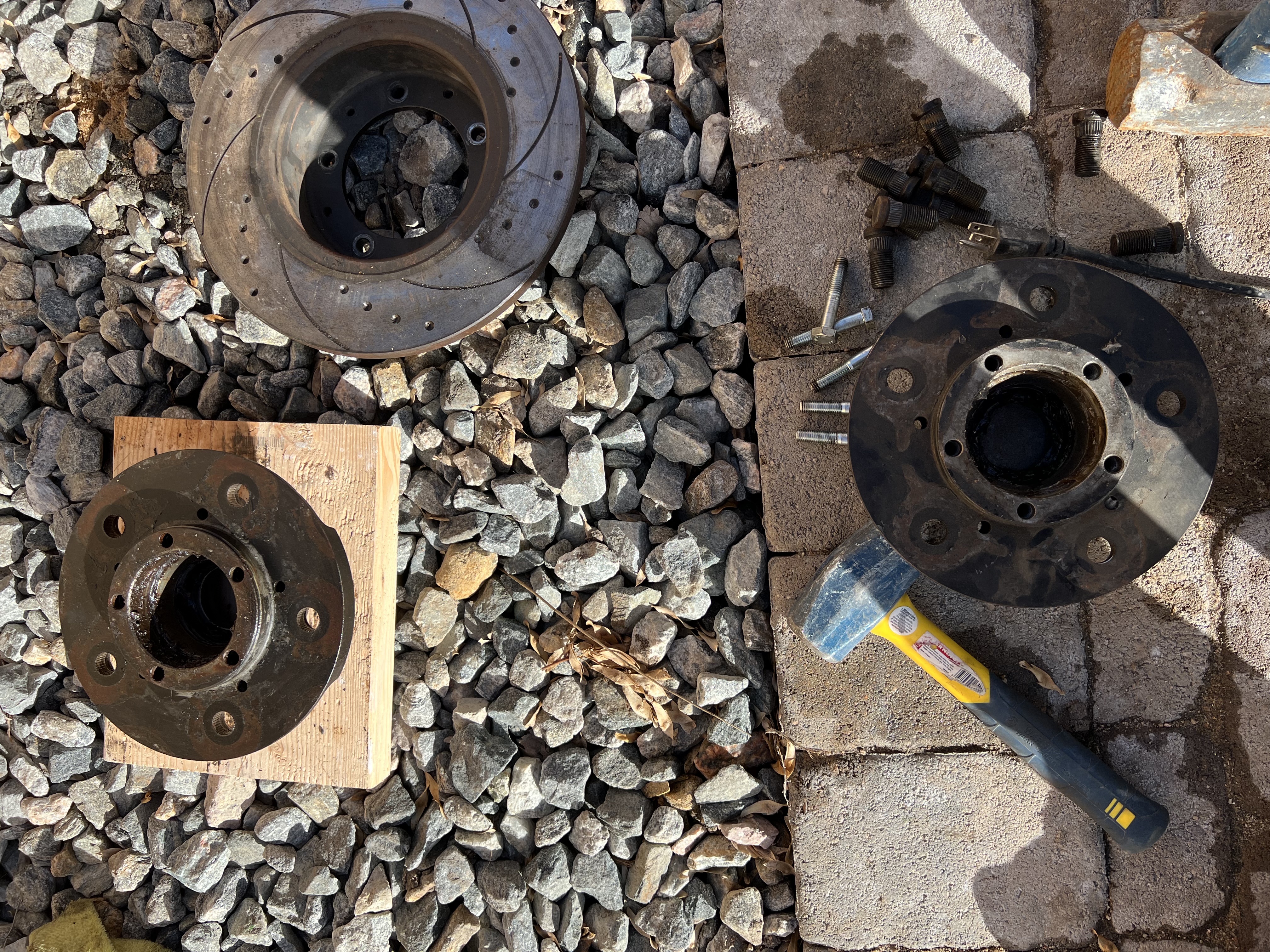 Made some major progress today. 3 of the 4 tires showed up. No clue what happened to the 4th but it has its own UPS label so hoping it turns up sooner than later lol. Finished re-wiring the O2 sensor connectors that were destroyed when the cats were stolen. Got one tire mounted up!! Knocked out the stock wheel studs on the hubs and will fit extended studs tomorrow! Rolling along with a deadline of the 15th quickly approaching.