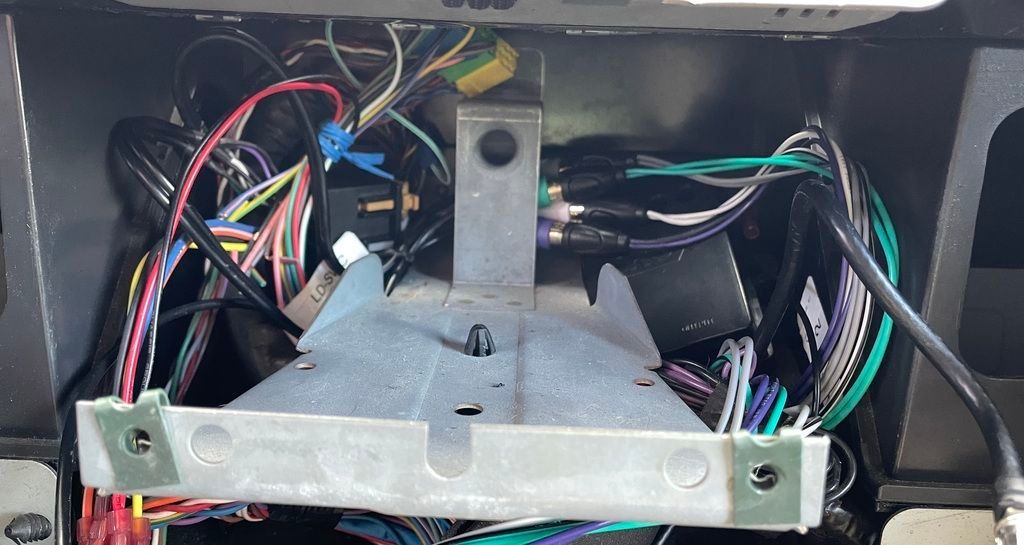 Then I removed the million screws holding the surround on. After that I connected the Crutchfield wiring harness and started working to fit it in. Eventually I got the two black boxes to settle to the side of the tray and then unplugged the RCA cables one-at-a-time to route them behind the vertical support piece. With that done, there was plenty of room: