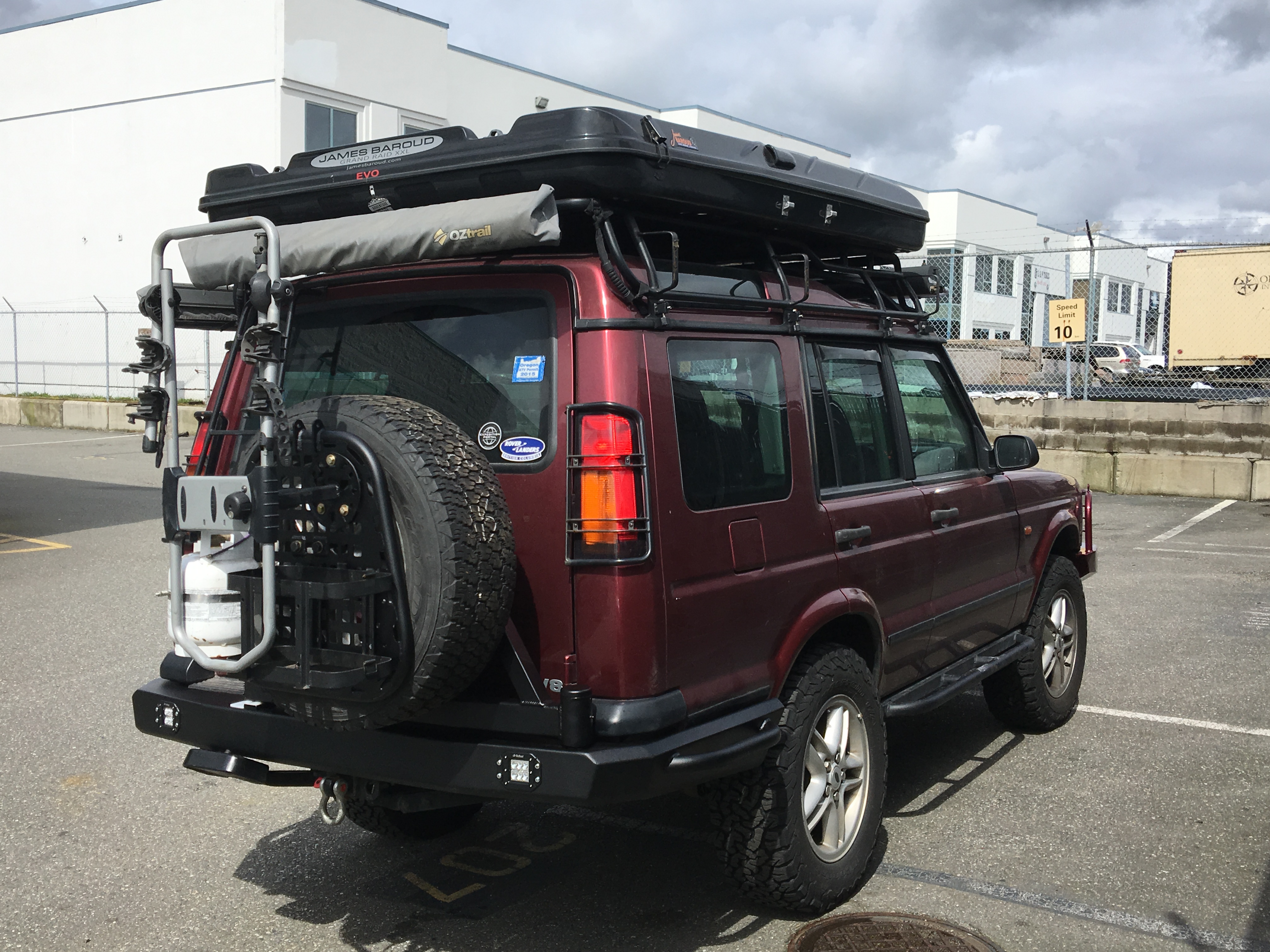 Smittybilt i-Rack (spare tire mount) to hold the propane tank. This give easy propane access to the cargo fold down table.