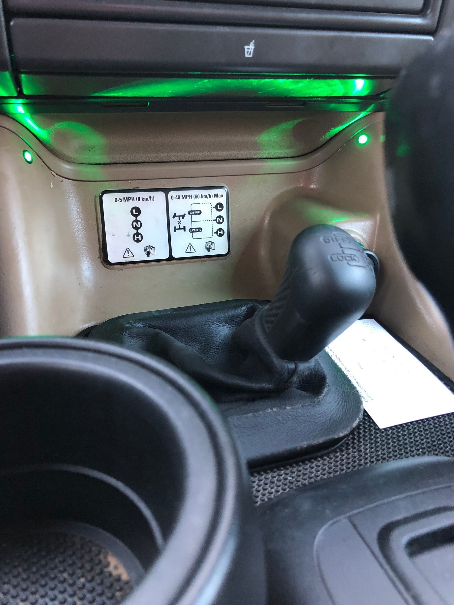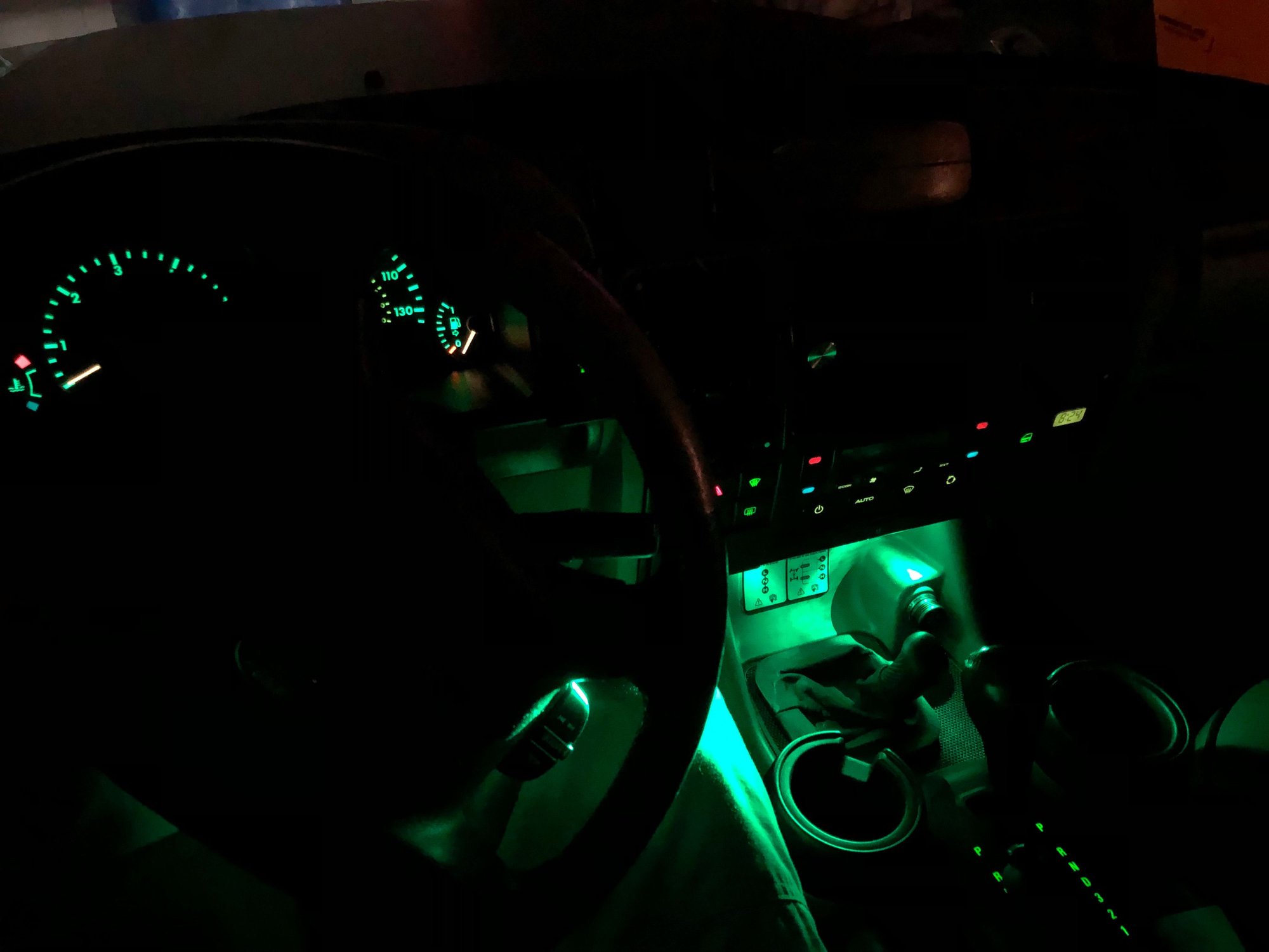 Next, I had wanted to add some interior lights: some for ambient, some for better visibility. The green ones are a bit too bright (despite being wired to the lighter and thus connected to the dimmer), and I’ll probably just put something over them or add a rheostat or the like, but it doesn’t impact my night vision at all.