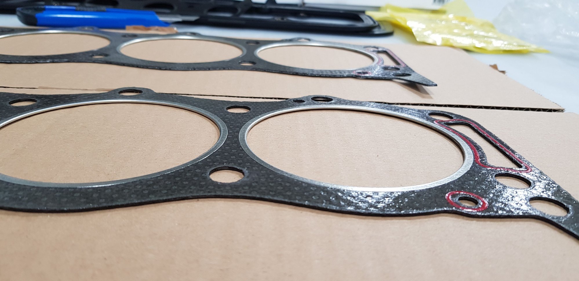 So I'm comparing your new head gaskets to the video from AB. Did you install them upside-down?? Dude in the video says the side with more metal showing faces out.