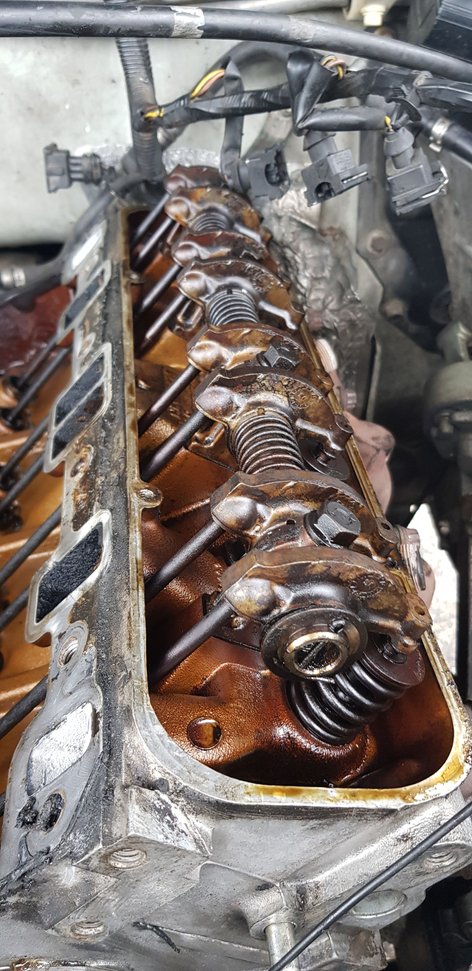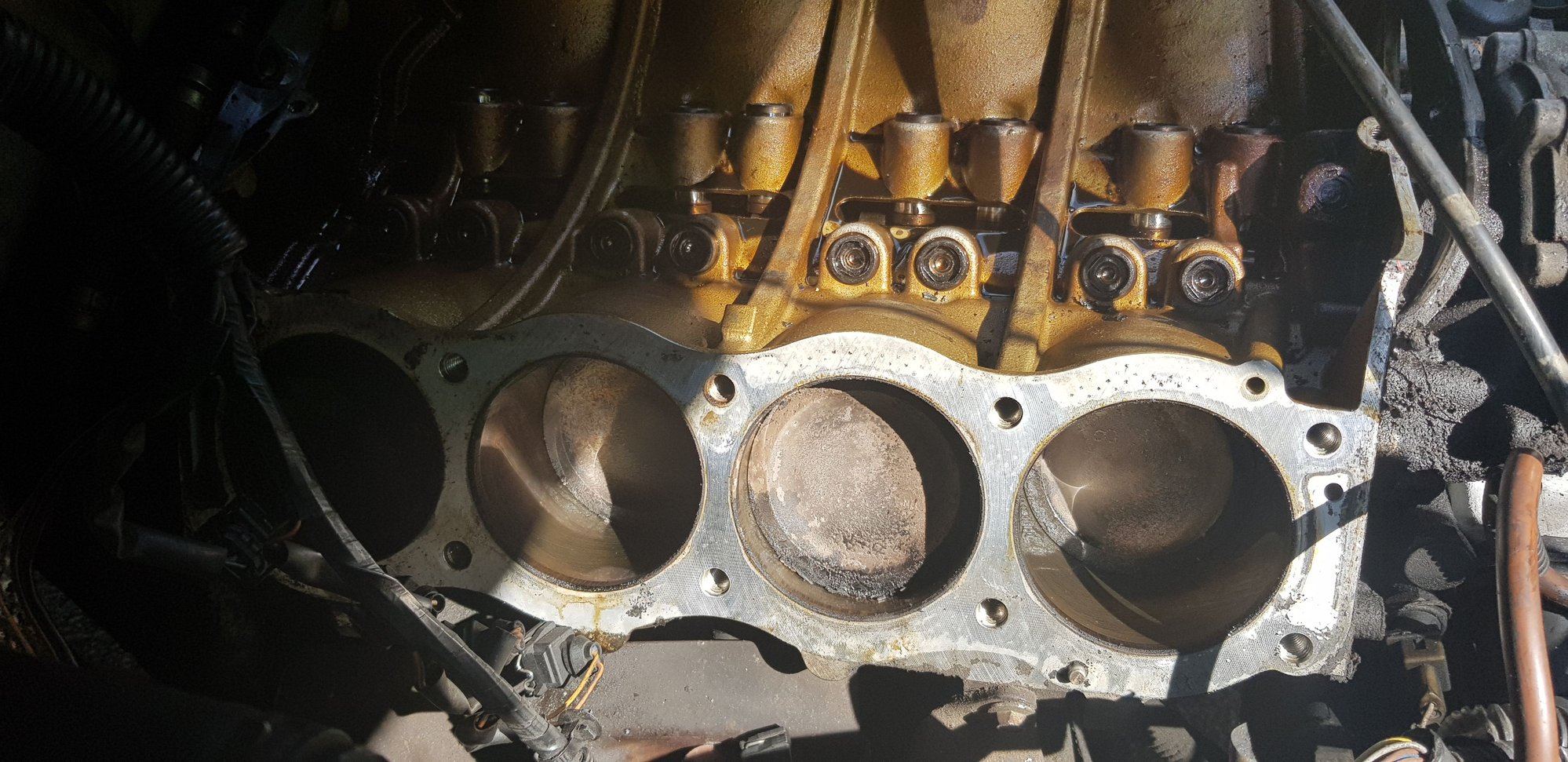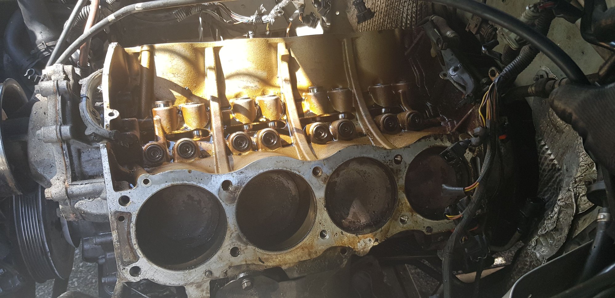 Today I started the head gasket job. Been using the Atlantic British "how to" video as a step by step reference. I've pulled everything off and am down to the heads. I dont have the trained eye for what looks good or bad but it does look as though the engine is free of engine sludge.