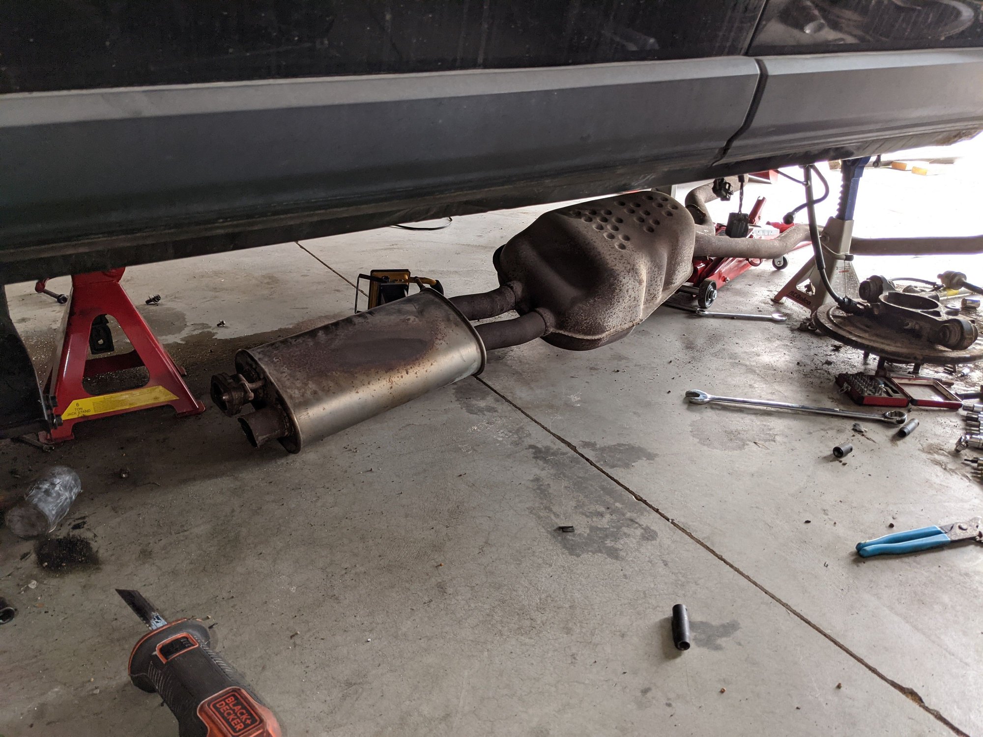 The going is slow. I need to drop the rear diff, but the exhaust is in the way. I tried to unbolt it just before the muffler, but the nuts on the flange and the band of the butt joint clamp were corroded to the point of being fused together. Nothing the sawzall couldn't fix.