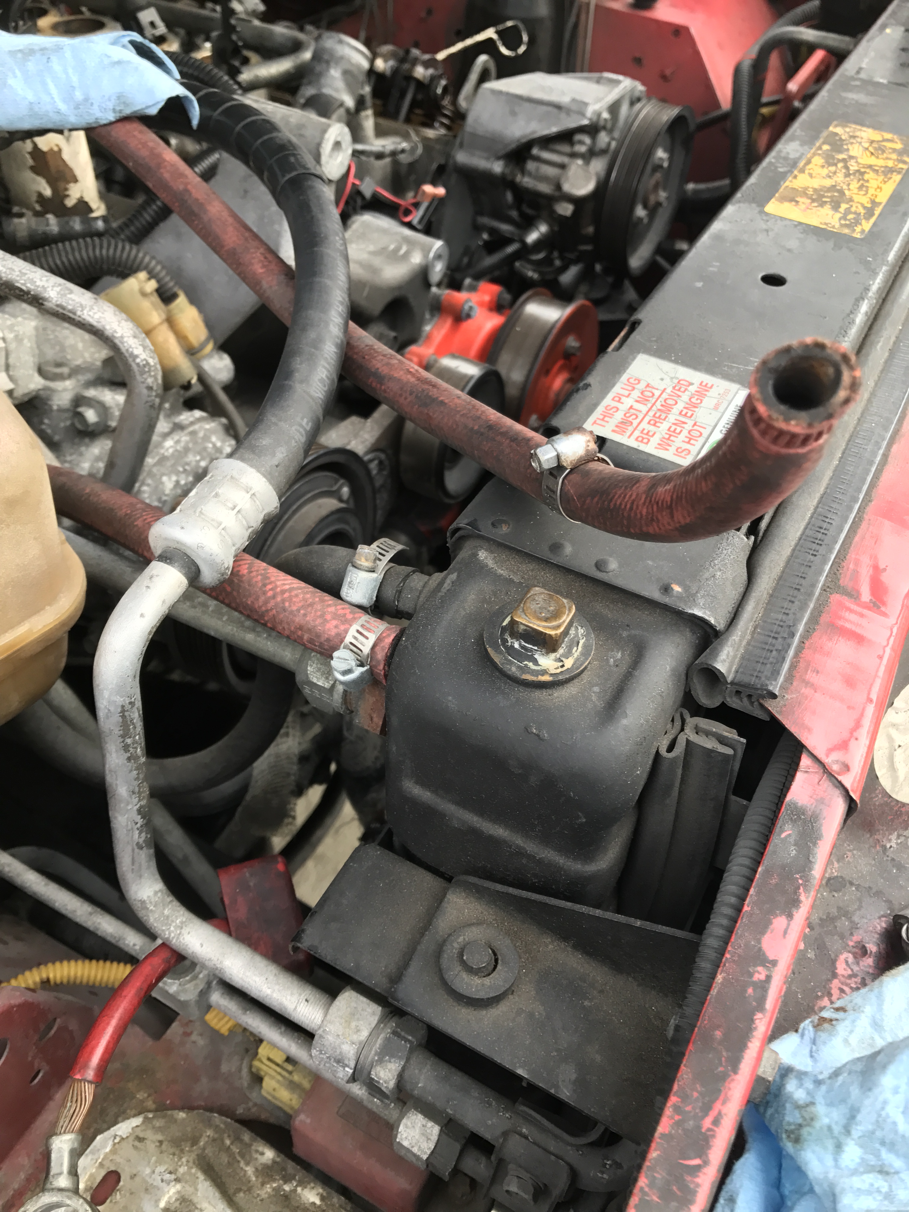 3. Just a headsup, the radiator fill plug is the wrong type. It looks like someone went lazy and used a NPT Plug with Teflon Tape to make a seal from Home Depot. The correct fill plug has BSPP threads NOT NPT and seals with an O ring. At this point you may be stuck because the threads are F'd up, so be real easy removing that plug.