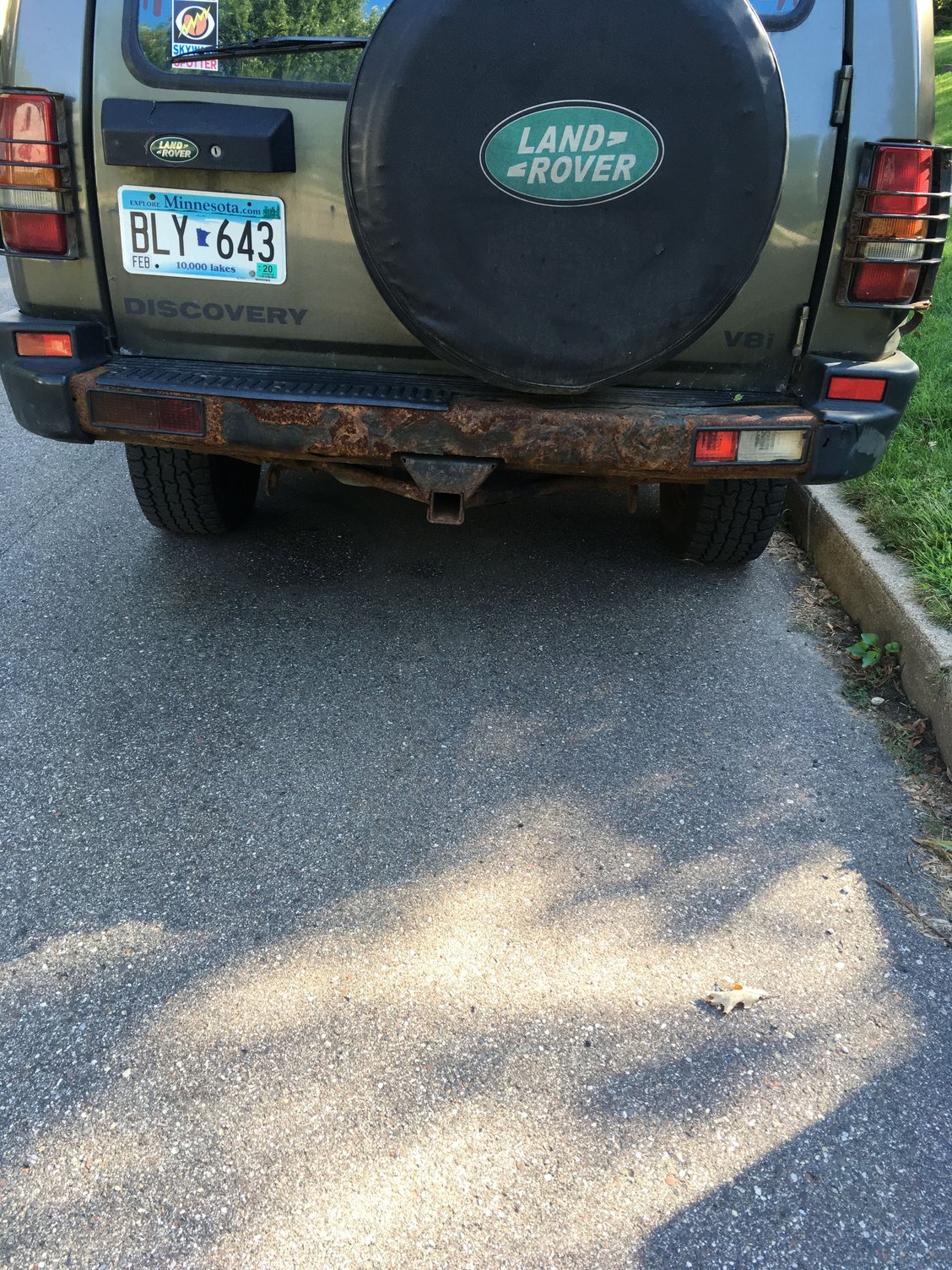When opening the rear door on my 97 Disco 1, it drags across the top of the bumper. Hinges look good, pins look good,no movement in the door when lifting on it. I noticed the bumper does look like it is tipped towards the body a bit, and there is a noticeable gap between the hitch and the bumper. Looking at the plastic seal between the bumper and the body on top of the bumper, it looks like the passenger side sits lower than the drivers side. The bumper viewed from the back also looks to be bent up a bit on the pass side, about the last 12-15 inches before the plastic end.