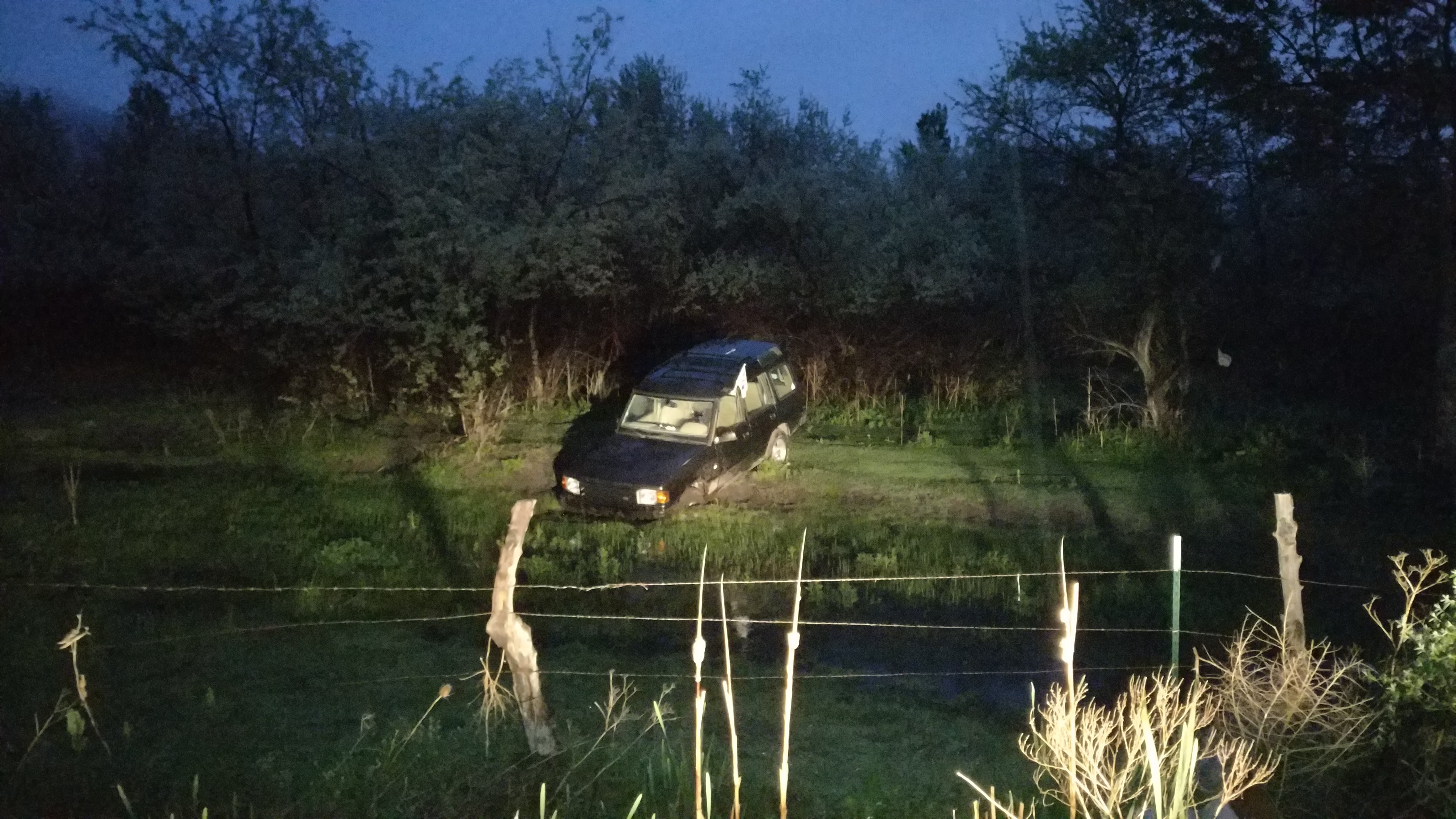 After trying every wrong technique I called my dad for a tow, thinking it would come right out with a tug. No such luck. After barely getting my dads truck out of the area (which was family owned property, luckily) we decided it couldn't be done with the tools we had, or the rain that was coming down still. So we had to wait it out.Next morning, the rain had stopped and we had found a small winch to pull me out, we grabbed some shovels and went to my forsaken Rover, which was, luckily, still there. We dug the bank out so it was more of a ramp rather than a small cliff, then used the winch until it made tension-full twanging sounds. The car was now half out. Reverse and Low were not cutting it. Then we did what we should have done very first, we borrowed a friends truck, (old Chevy 4x4) and pulled it out in seconds. Minutes later, I was sliding and skidding around, not having learned my lesson. Many more minutes later, we were at the car wash, washing out my entire front half, getting mud and such that had soaked and rubbed in for 15 hours+. During this whole process, we removed several cubic feet of mud from the underside of my car, and inside and around the wheels. What was a fun outing with a friend, turned into a father - son adventure. My Landy now sits happy and not in a river, on the driveway.