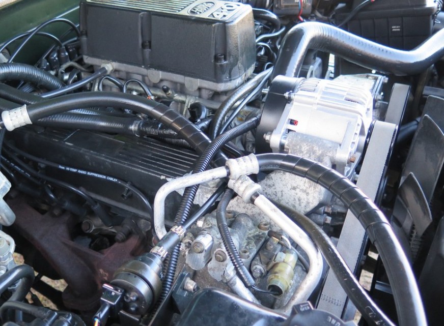 Some route the wires over the top of the A/C compressor. I believe stock is for it to emerge from the outboard side.