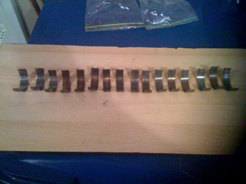 Ok here are pictures of the rod bearings. Pretty interesting the way they look from back to front. 8/7 are on the left and count down to #1 all the way on the right. Far left is really thin and no copper there at all. 6/5/4 are showing mostly copper and 3/2/1 are only showing a little copper