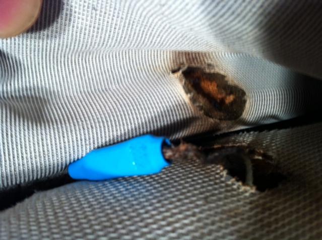 6. If you're lucky like me, when you lift up the seat leather cover and the left side, you will see the infamous burn mark as shown on the photo.