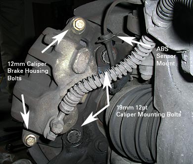 And finally my final question is does anyone know the dimensions of the front caliper guide pin bolts? I know they are 12mm 6 point. But I need to know how long and how thick. Haven't taken any out yet and I need to see if I can pick up something from the local hardware store to replace the stripped bolt thats still stuck in the caliper. See pic below for a pic of exactly which bolt Im referring to.
