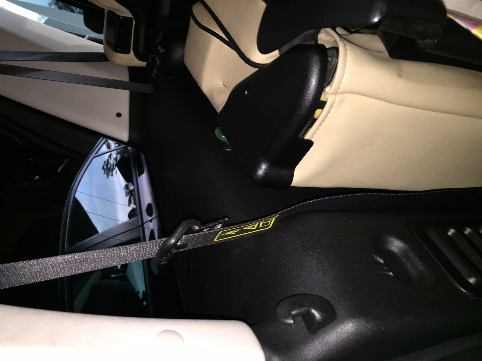 Then you need to remove the plastic panel over/around the window (one of those plastic studs is actually a screw & cover, otherwise they just pull out), and the seat belts (do NOT allow them to retract more than they are when they are just hanging, or they will not feed out again), and then the little remote and it's fitting, and power socket. and finally, you can then remove the lower panel. At least, I don't think you have to remove the head rests and that little strip. I can't remember for sure.