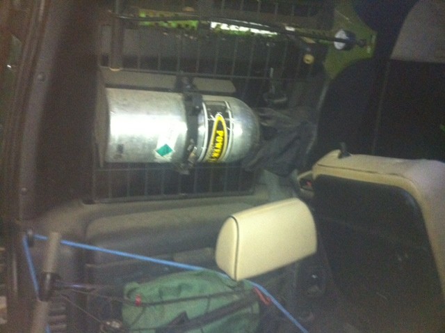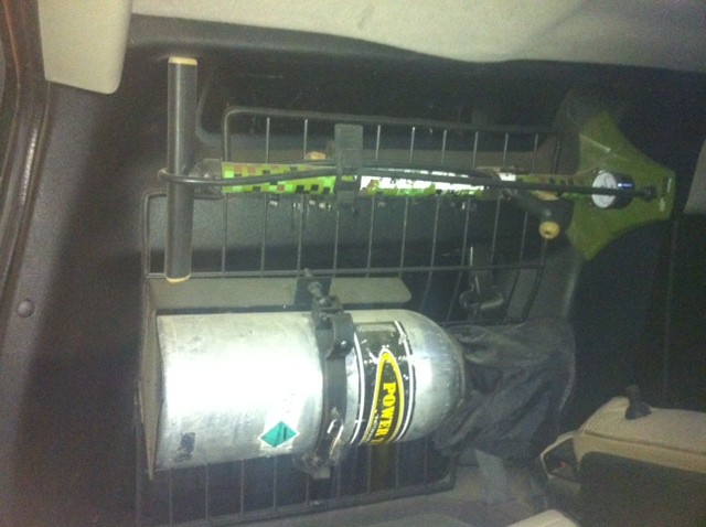 I used a heavy gauge piece of shelving that I scored from Home Depot. I cut it to fit in the window area, also bent/wrapped it to curve up the contour of the Alpine window. Then I took off the interior alpine molding. I sprayed it with black Rust-Oleum bed liner to match my bumper and black cargo bins. Wrapped the outside of the rack with 1/4" wire loom from Harbor Freight. I used PowerGrab to mount a piece of wood behind the interior molding where it screws in at the top. The cargo bin still opens fine. Since I'm not an Owl and can't turn my head 360 I never look out of that window anyway. Its the Rover Sticker window. My rover is so darkly tinted no can see that I have a power tank unless they are snooping with a flashlight. Its parked in the garage away from all the potential thievery.