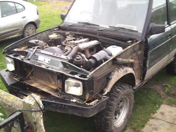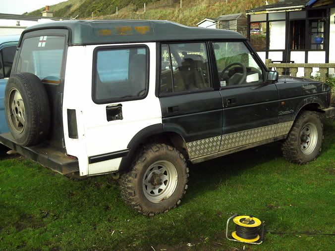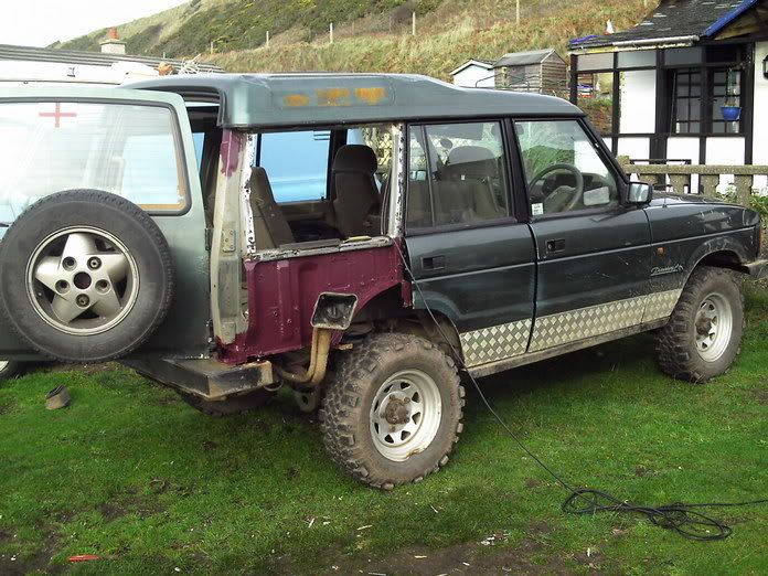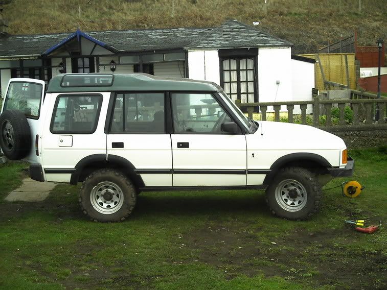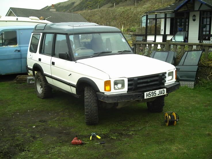 Wheels are now range rover alloys(no pics yet) and the front bumper is now discover,the sump gard and diff gards are all gone too, I have no need for them, the suspention is to be dropped next, back to standard road hight, the seats and door cards are to be changed to Range rover. Next Monday the rocksliders are to be cut off and new colour coded sill covers are to be fitted.