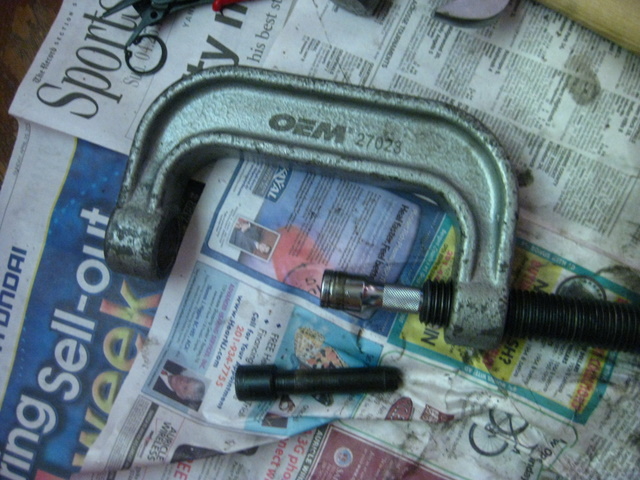 The misaligned and tight press (since I couldn't get it to close that far, I put a 1/2" drive ratchet extension into it. That closed the gap.)