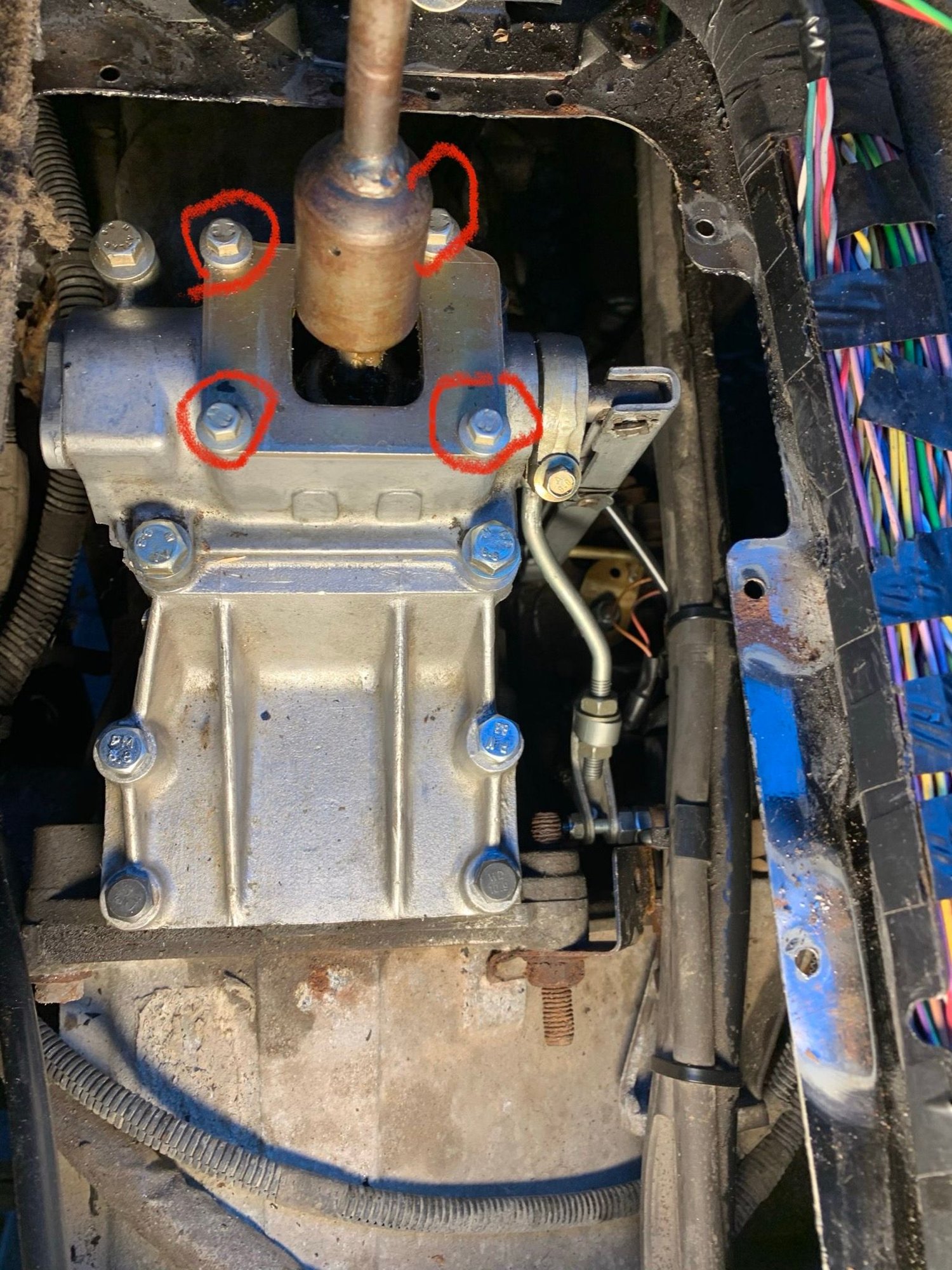 Ah. Turns out I don’t. They are below that plate. Just the lever comes through. Now it’s mounted to the transfer case it really doesn’t need them.