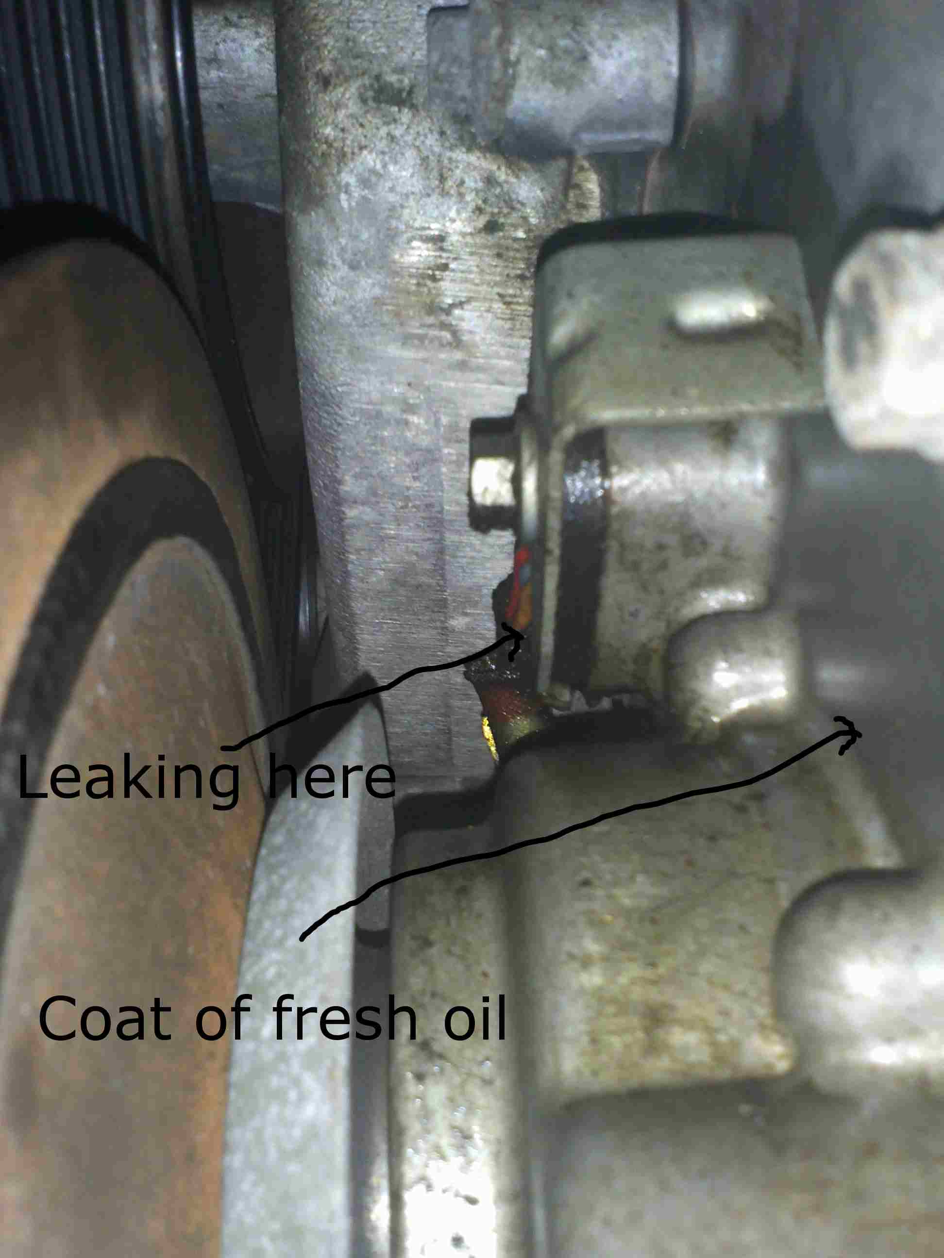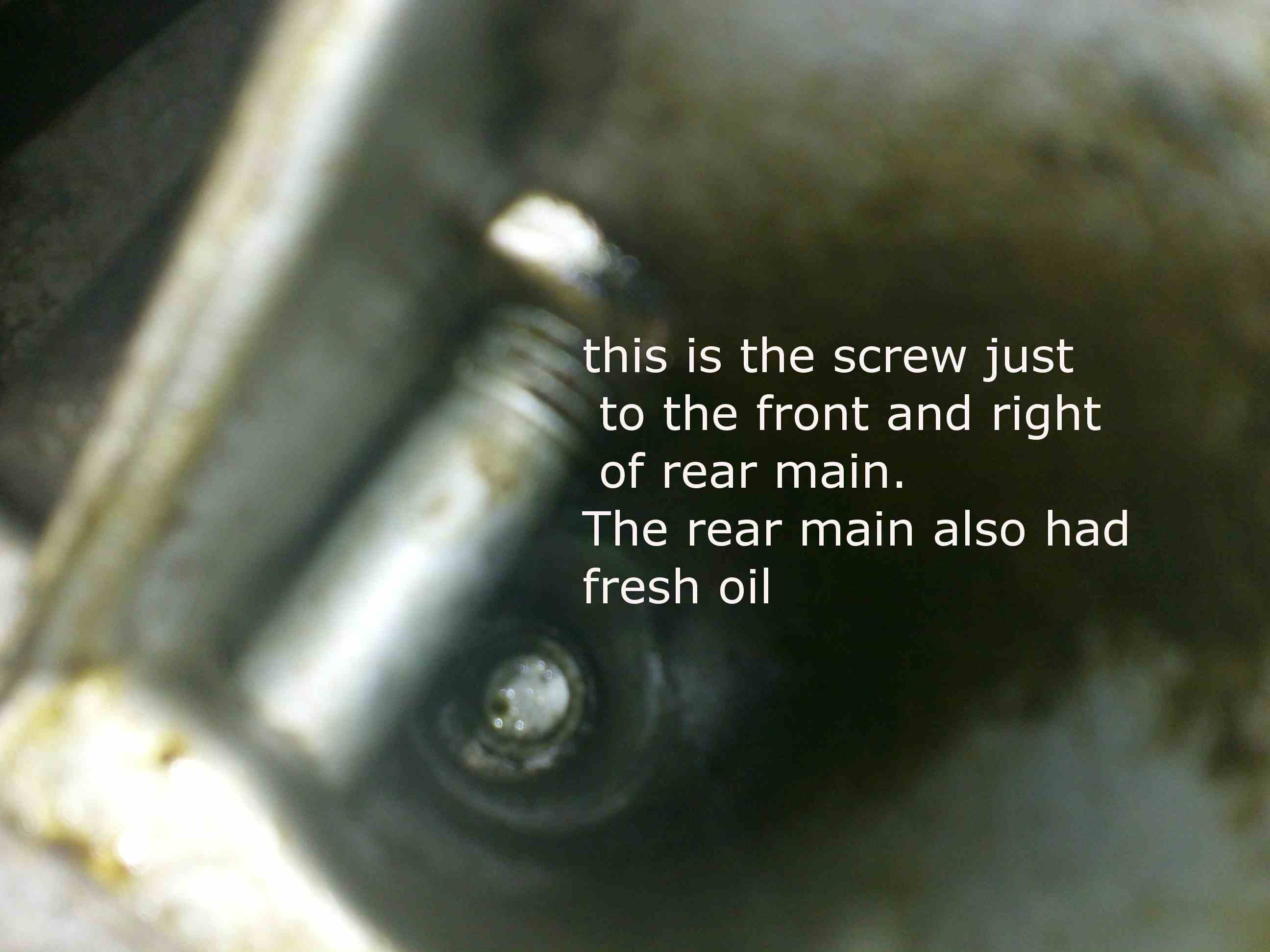 1. seapage from rear main (fresh oil) and the right hand screw just in the front of the rear main seal in a deep whole (Picture#1).