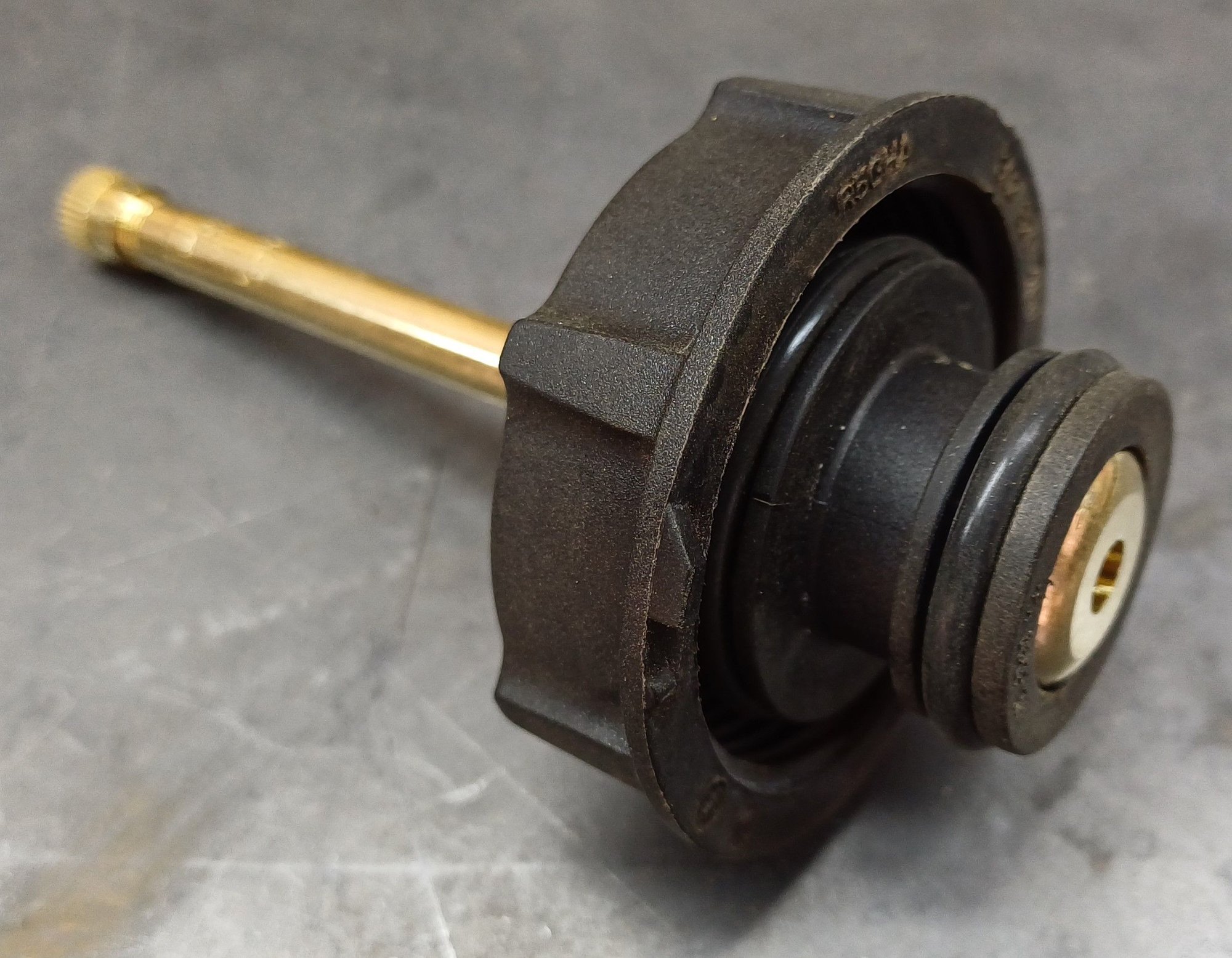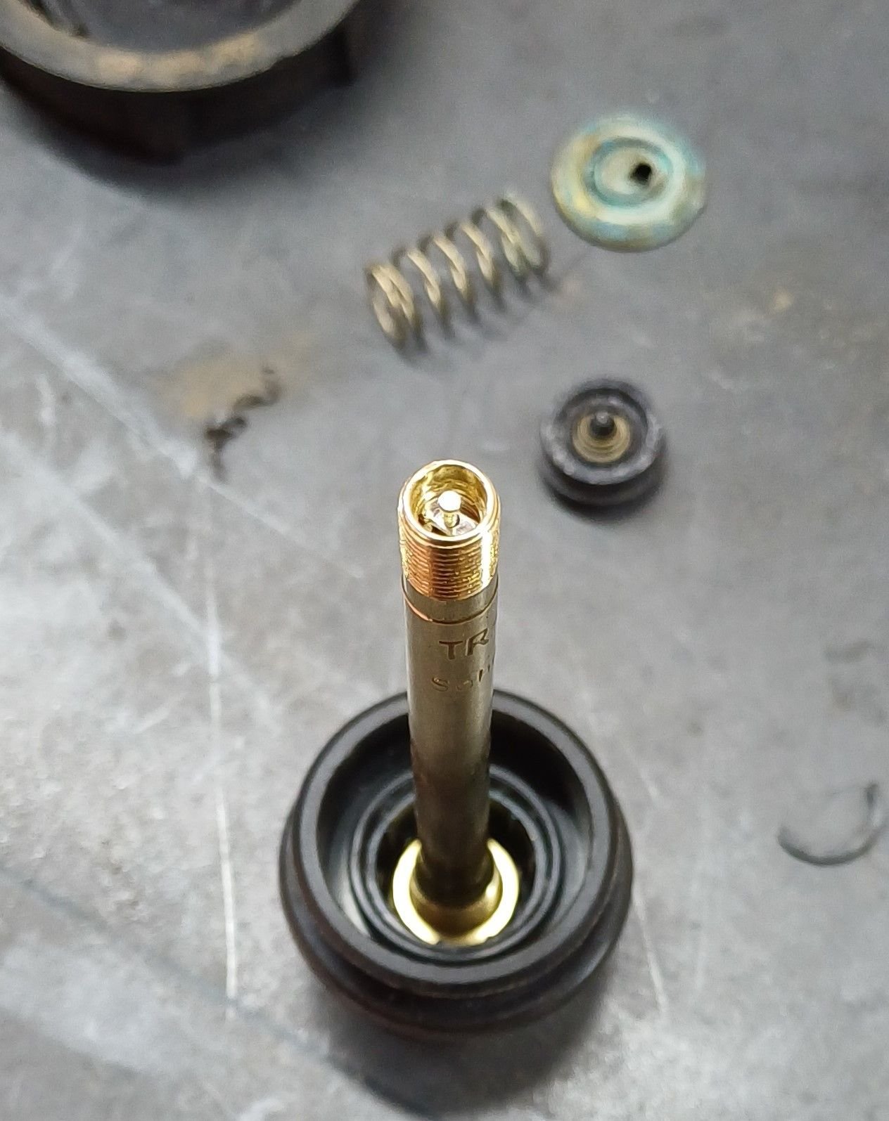 5. I went to a tractor-trailer/transport truck shop and bought a TR573 valve stem. I removed the stock rubber bushing at the bottom and cut a circular seal out of an old bicycle innertube. It fits perfectly in the lower assembly. I dropped the nut into the hole in the lower assembly and just tightened the valve stem by hand, which should be more than sufficient.