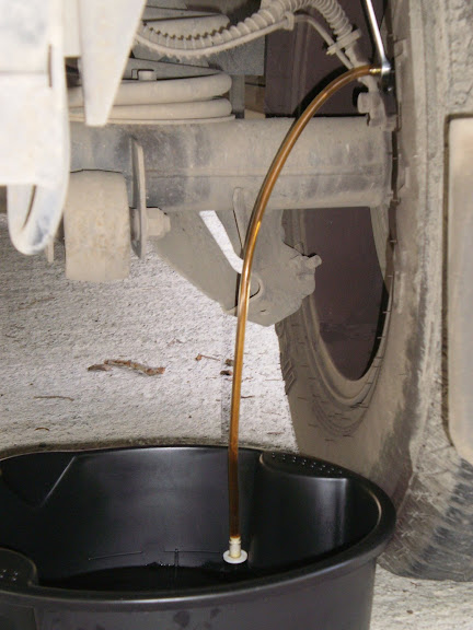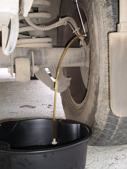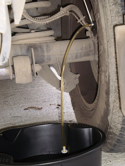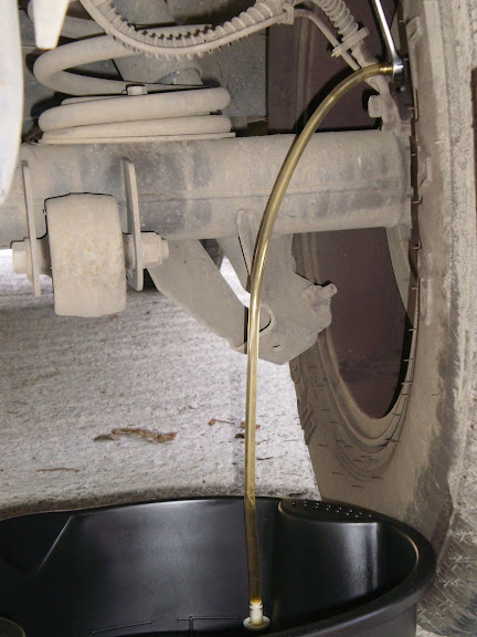 To add to spike's wonderful write-up, here it is using a ONE MAN BLEED tool. What is cool about this tool is that it uses a ONE-WAY valve allowing fluid out but no fluid/air back. I often work alone so I don't have a helper pumping brakes for me.