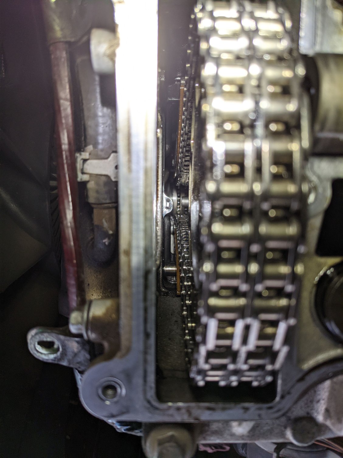 Hi a bolt has fallen in where the timing chain runs and is at the bottom , can I get to it by dropping the oil Catch or will I have to take the timing chain cover off as well The small bolt/screw is at the bottom left ,beside the cog
