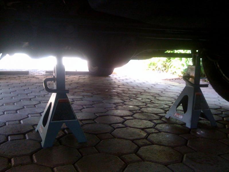 Next was to lift truck up on floor jacks. i lifted the truck under the front diff and slid a floor jack under the passenger side. I then put the jack under the drivers side aand then place one also. I put the emergency brake on and wood chocks behind the rear wheels