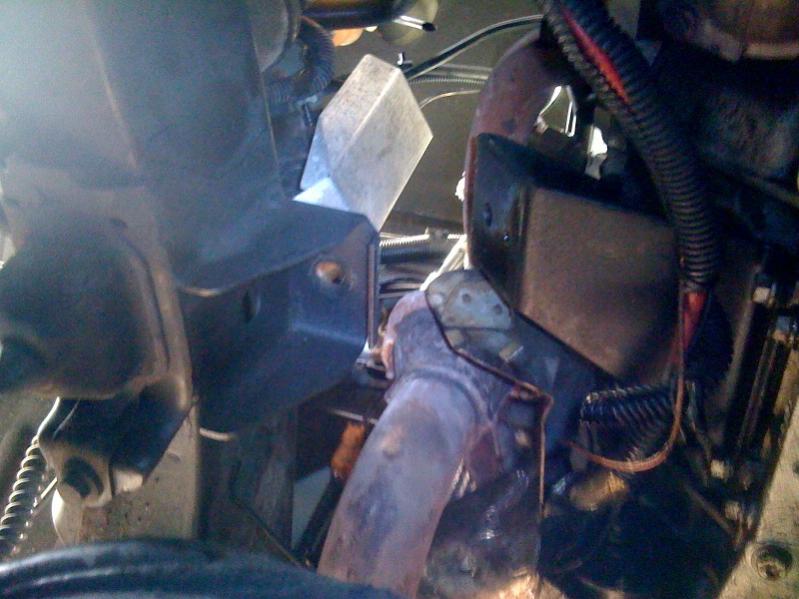 Step 4: After you get the nuts off take them and run them over the new mount screws a couple time so you will be able to finger tighten then which will help get them back on. I didnt take the nuts off the drivers side when i did the passenger side. Start jacking the engine untill you see the mount comming off. It takes a bit for it to move. When it clears and you will have to check with each crank of the jack, lift the mount up and off. " BE CARFULL WITH WHERE YOU FINGERS ARE". Tighten the top nut first as there is a dowel with the screw and need to be in the bracket as well a heat shield. Hand tighten so the dowel is in the right place and then slowly lower the engine... Slowly... untill the bottom screw lowers them the hole on the bracket. Make sure the mount looks like it's sitting correctly and then tighten the nuts. I used hand tightening as what i thought they where when i got them off. You can use a torq wrench if you can get it in the space. Ok one done...