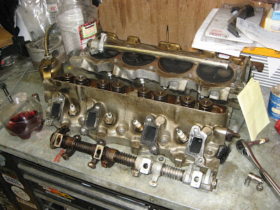 notice the rocker shaft, soaked half in Purple Power - cleans stuff good! I will still disassemble but this makes the process a bit less messy.