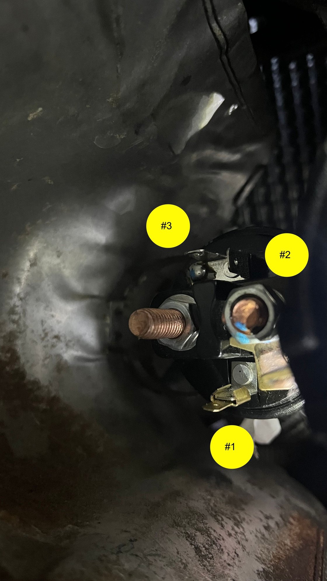 We did it folks!! @gecko951 was spot on! I was so excited reading your comment last night that I got up early this morning to try it out. You'll see from the picture I've attached that when I had the battery lead connected to the starter, it was twisted and making contact with #3. I had the signal wire attached to #1. This morning when I removed the battery lead, I could see evidence of sparking against #3. So instead I turned the battery lead down instead of up, and bent #1 far out of the way. Then I connected the signal wire to #2