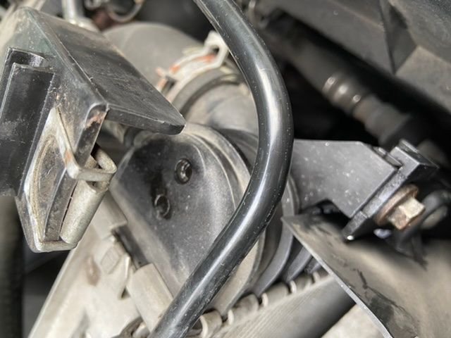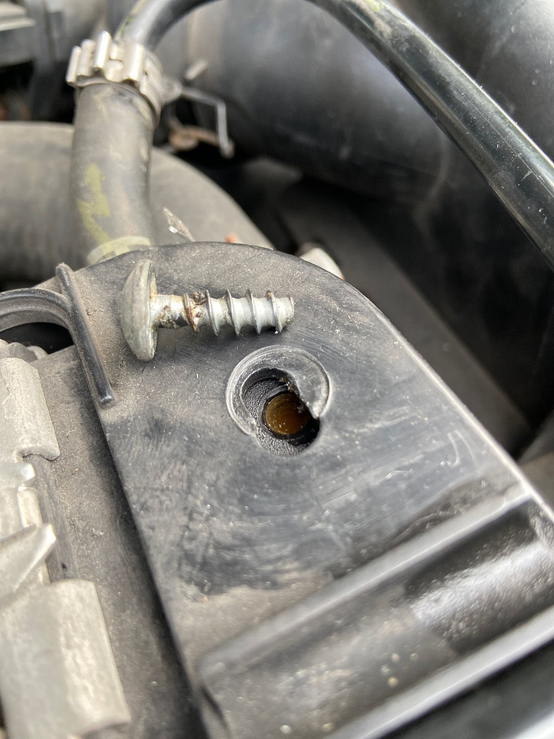 Truck has been sitting for a few days. Was just about to do the FV308 PCV mod but I happened to notice I am leaking coolant. Traced it all the way back up to this screw hole which otherwise seems to only be for securing the shroud/cover.
