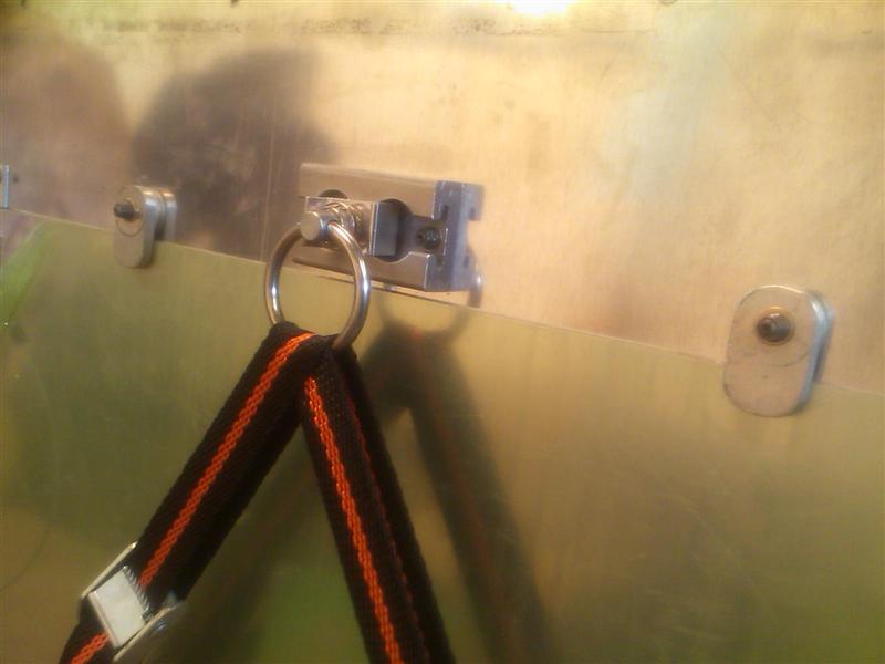 3 pieces of cargo rail to allow the strap / tie downs to be connected / disconnected easily. Made 2 small turn buckles from ali to hold the shelf when folded up