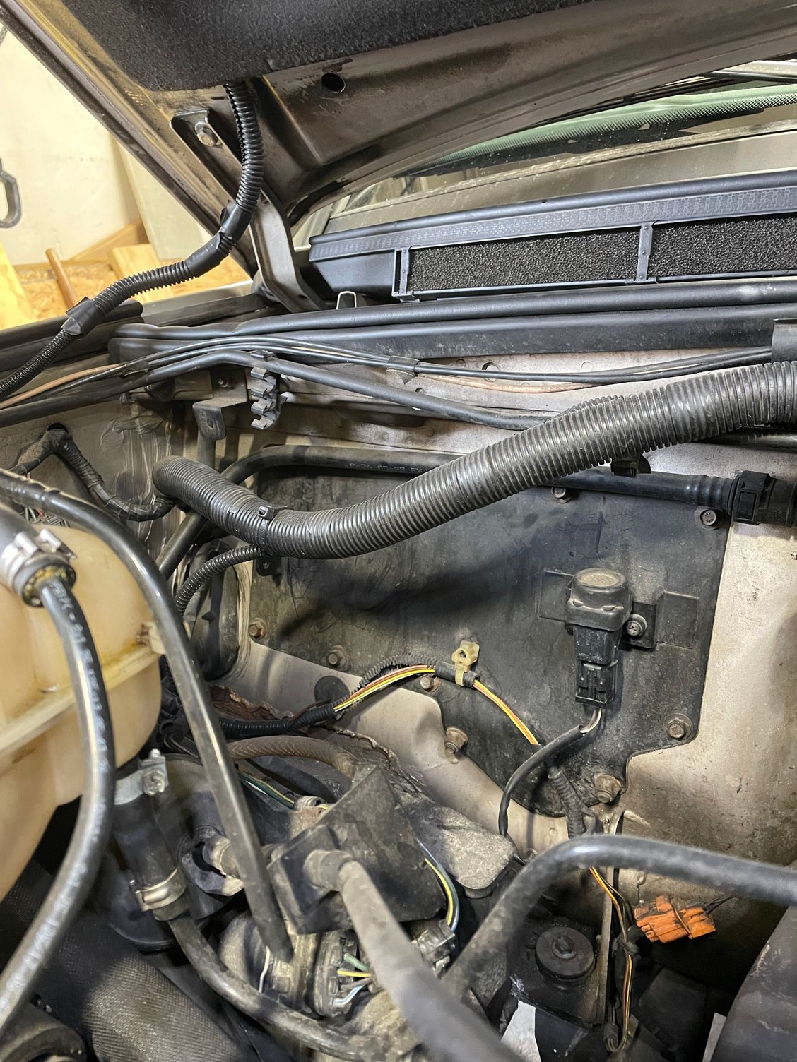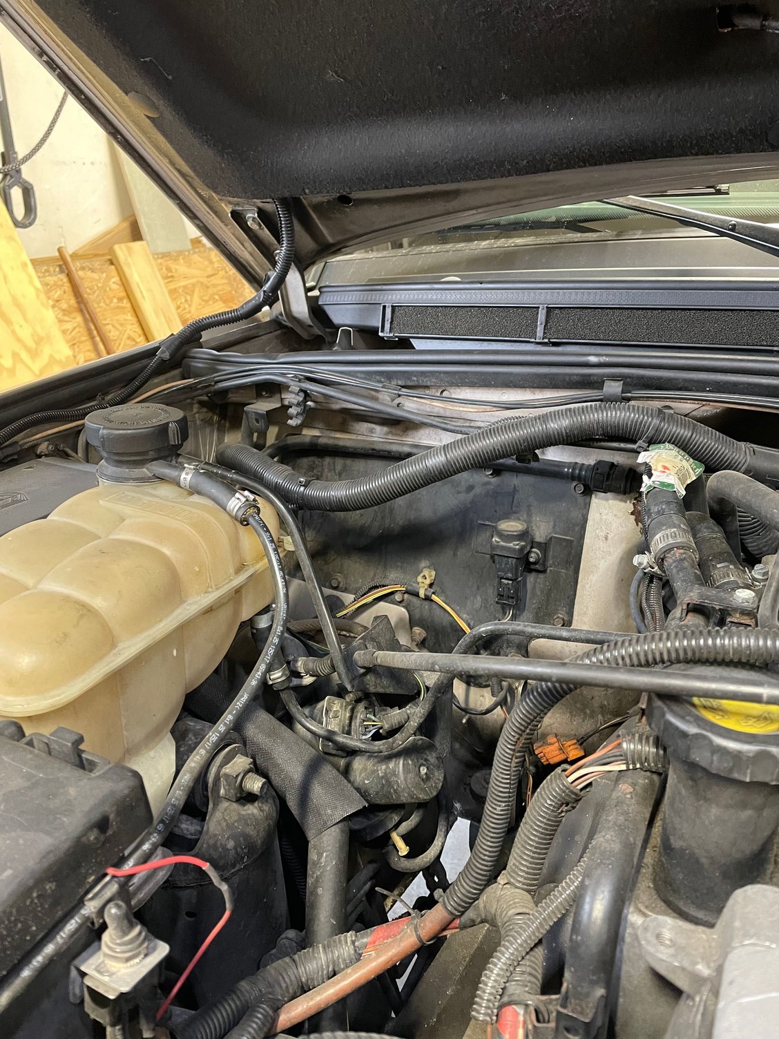 On the passenger side of truck on the firewall, behind the fuse box and coolant reservoir is what I would call a blanking plate, black, where I believe the SAI system would go. My truck is a '00 in Indiana, and the SAI system is not needed. What is on the other side of this plate? I would like to relocated my washer bottle there (I have a Defender bottle with new pumps and extra hose), but I wanted to verify what is on the other side of this plate. Don't want to hit any electronics when working on the attachment. Apologies for the dirty engine compartment. Been too cold to clean it up in Indianapolis.