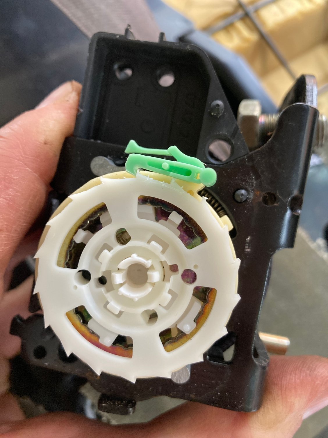 All, No need to buy another seatbelt. I had the problem last night and fixed everything in about 30 minutes. The PDF from DiscoDOS will tell you how to get to the belt mechanism. Take it off. Once off, you’ll see that One side has a flat piece of plastic (the part that holds the spring)...don’t touch that. The other side has a plastic cover and it basically slides off with a flathead. Once inside you’ll see a metal V shaped pin on the top...take that off. Now get a small object (I used the SIM card removal tool from my iPhone) and stick it in at an angle like the picture shows. It may require some movement but if you push it in it’ll disengage the seat belt lock so you can pull out the slack you’ll need to fix the belt. Don’t forget to put the pin back in. Mine works just fine now. I hope this helps. Thanks, Gary