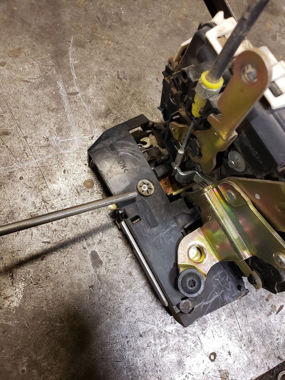 Pin came out of the keeper, preventing full movment Made a tool that would fit inside door to manipulate the latch Insert between plastic housing and release lever Pull down and to release latch