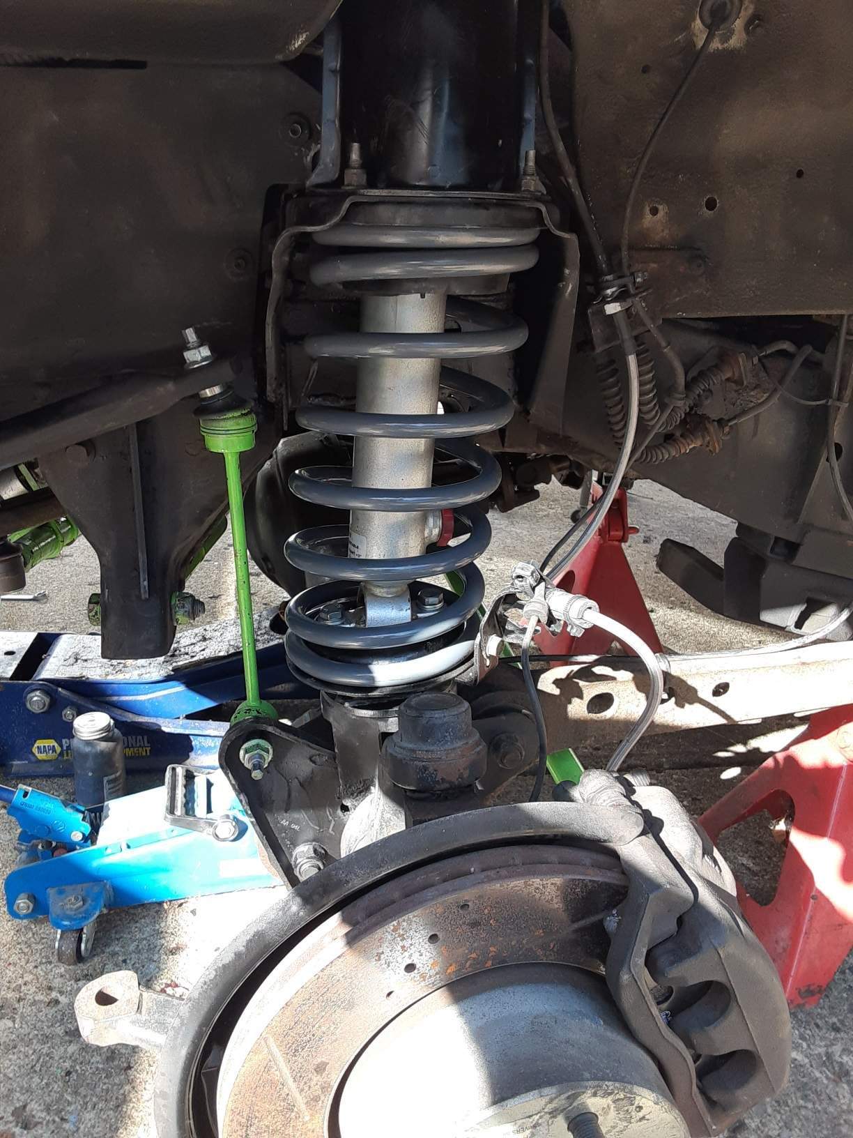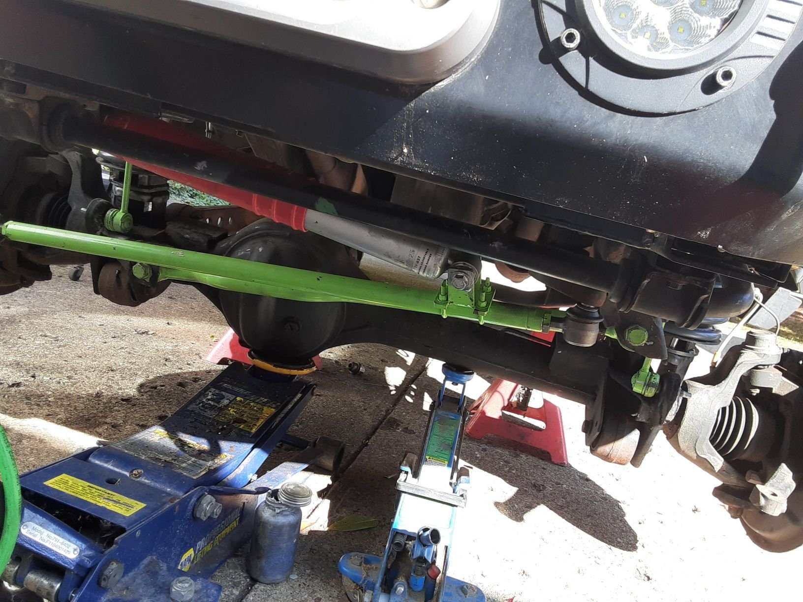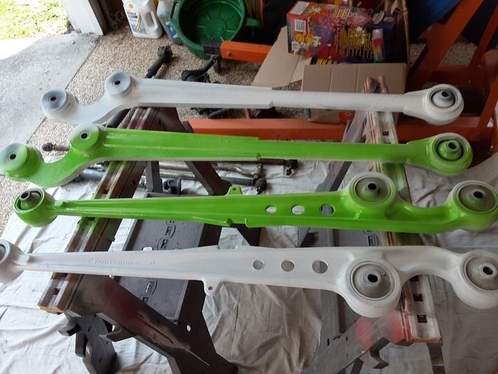 parts painted. very disappointed with 2 different rustoleum primers. neither worked well with lacquer rustoleum bright green paint ( and rustoleum doesn't label primer cans as to which topcoat they work with)! Should have powdercoated, but then I would have to press out all the bushings...no biggy. going under truck anyway....rustoleum gloss black worked great on the D shafts.....waiting on new tie rod ends for the heavy duty rods...