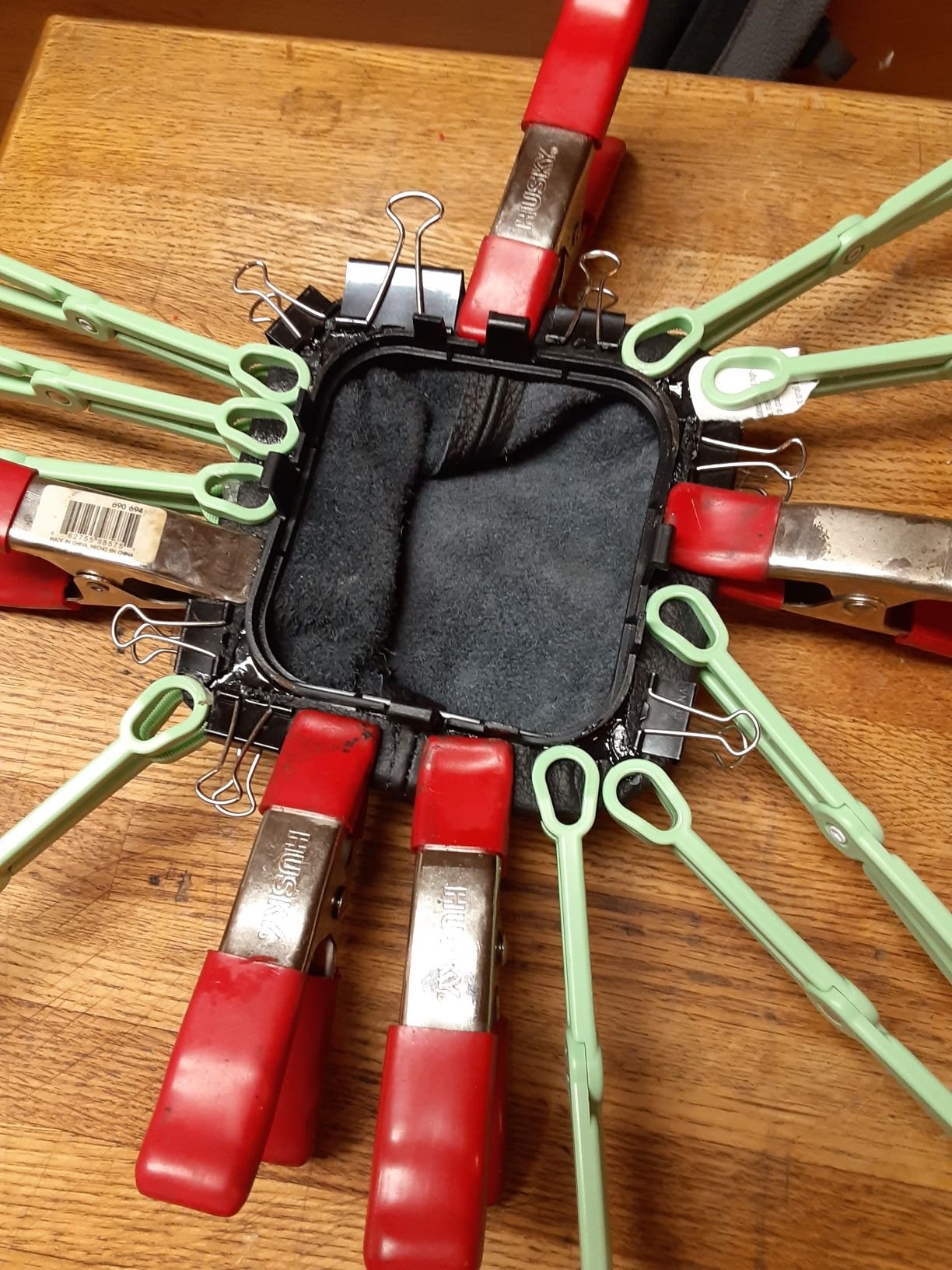 The front clamp on the Borla muffler was bent. The studs in the OEM 'Y' cat pipe were frozen so I cut through the bolts and cut off both clamps. Tried to find stainless, but could not find 'molded frame' split clamps in stainless, so just ordered mild steel split clamps off ebay. will see how they work out. 2 1/2" ID for the clamps (the front clamps only!..the other two are 2 1/4 stainless band clamps)...