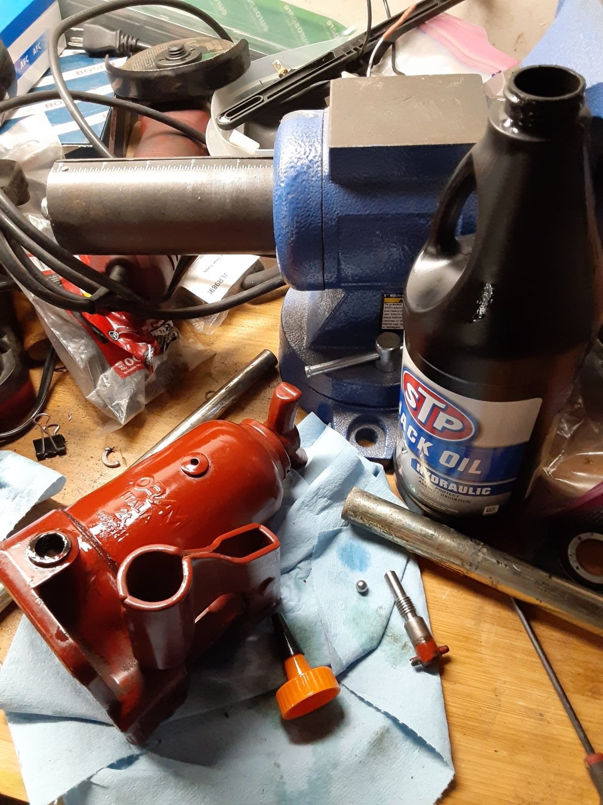I also tested my OEM jack which was not working. Turned out it was missing the ball for the valve. So I had a few ***** left over from front seat track repair. The ball measured a bit over 1/4 (actually, .275), but worked just fine. Use jack oil. You can get it at autozone.... Fill slowly at the valve until no more air bubbles exit.