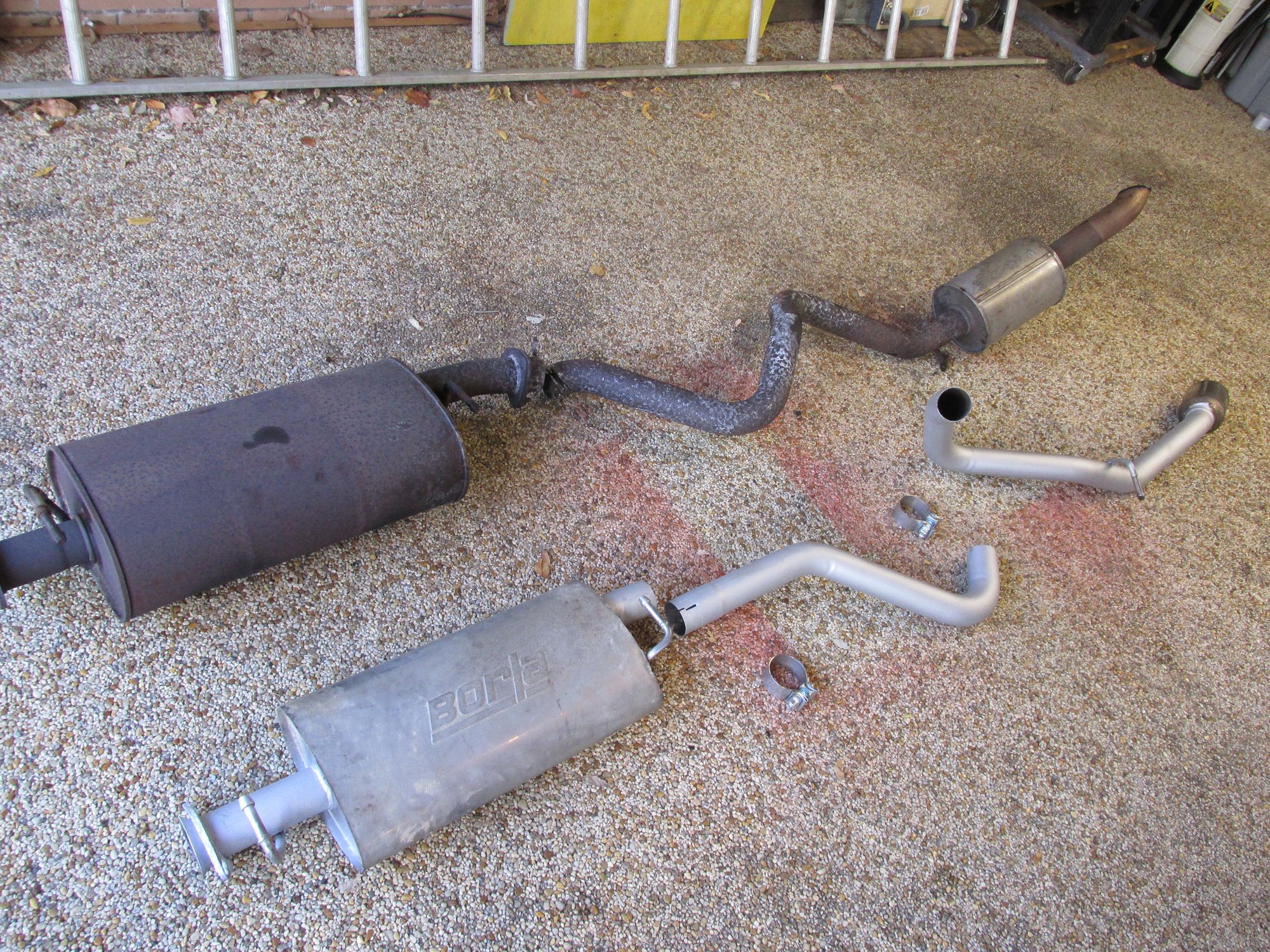 Installing my Borla exhaust system. Super light compared to original. Original was I think the 'original' exhaust from 2004. front muffler inlet weld broke. i welded it up and used it for a while. I cleaned and high temp painted the Borla pipes. Borla says they are 'all' stainless, but the pipes are lower quality stainless than the muffler, and had very minor surface corrosion. A bit of paint won't hurt. I had this on my 2001 disco. I spoke to a Borla rep the other day. They do not make these anymore and don't plan on it, but the exhaust has a lifetime warranty so I could send it back for free repairs if ever needed.