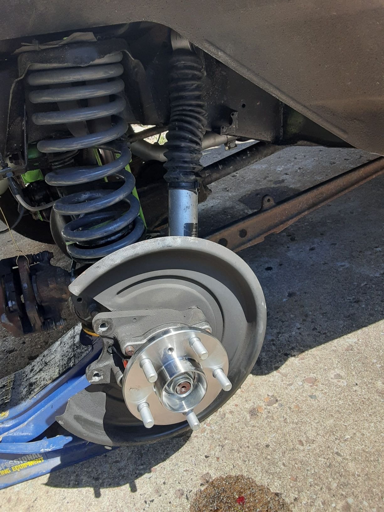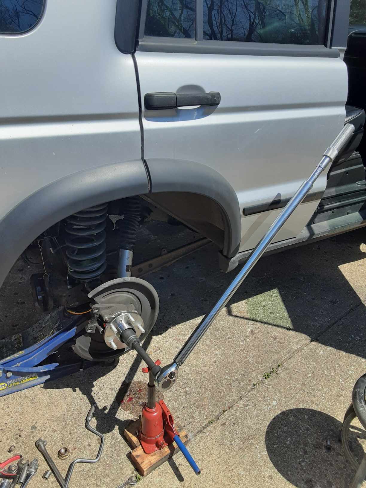 Nice day finally! Changed out rear hub. It was leaking from the bearing seal. Easy with right tools. 4 ft breaker bar and 4 ft torque wrench. Bottle jack does come in handy for something........