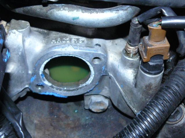 A temporary water temp gauge could be installed just under the hood for testing. Here is a pix of the intake area with stat removed. The coolant to ECU sensor is on the right, gauge sensor has the single wire. That "bolt" at the bottom is a plug for what used to be the hot water to heater core in older designs, and might be present on yours. A potential spot to plumb in a gauge sender. Of course, you might be using your old sensor with the old gauge, and in theory it should be working. In which case the temp range is scary.