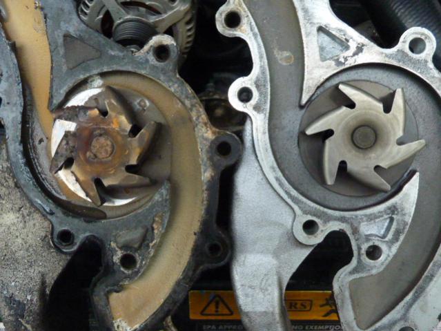 13. Water pump could also be toast, not circulating enough water, everything overheats and heat no work. About $50 (Rock Auto on line) and 1 hour. Pix of bad water pump.