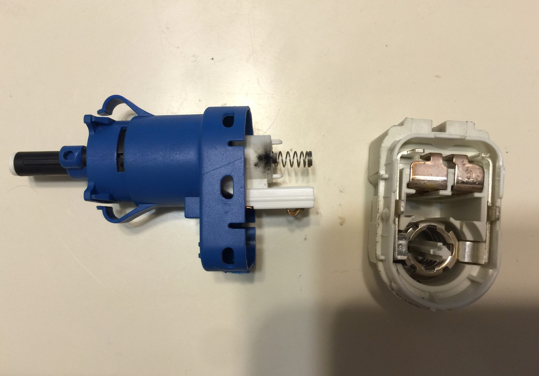 I replaced the brake light switch, as this is usually the first thing to check when these warning lights come on. This is what it looks like on the inside of the brake light switch. I'm guessing it means the switch was bad, due to the black residue? The lights are still on, though.